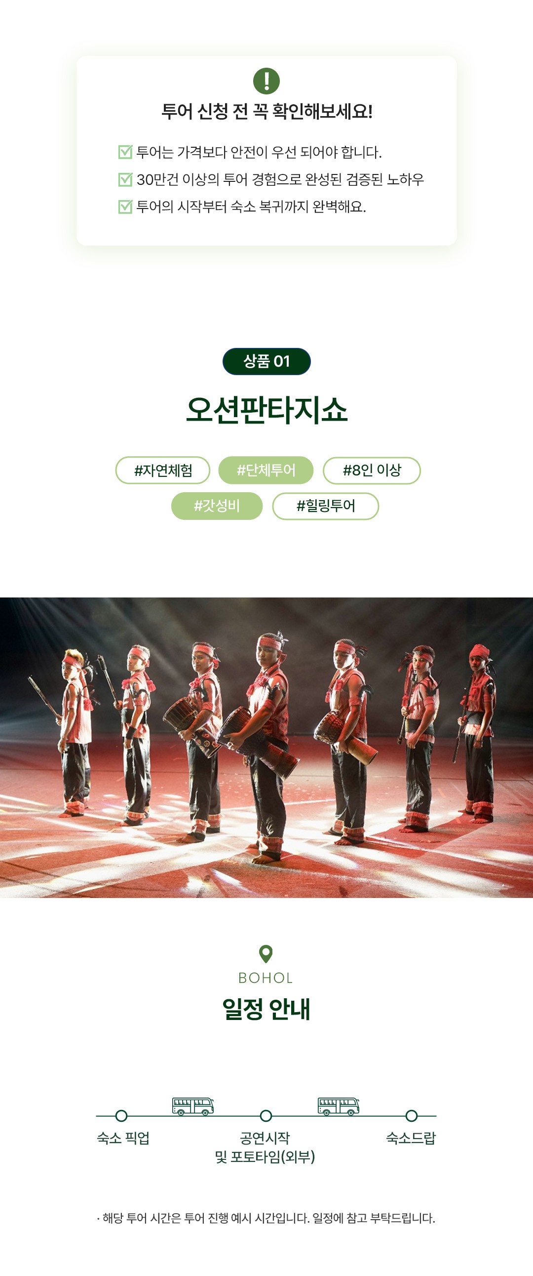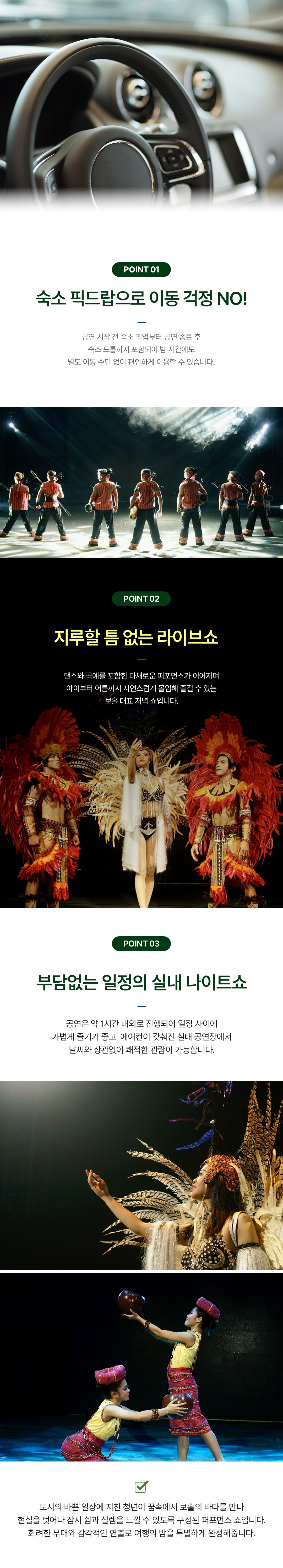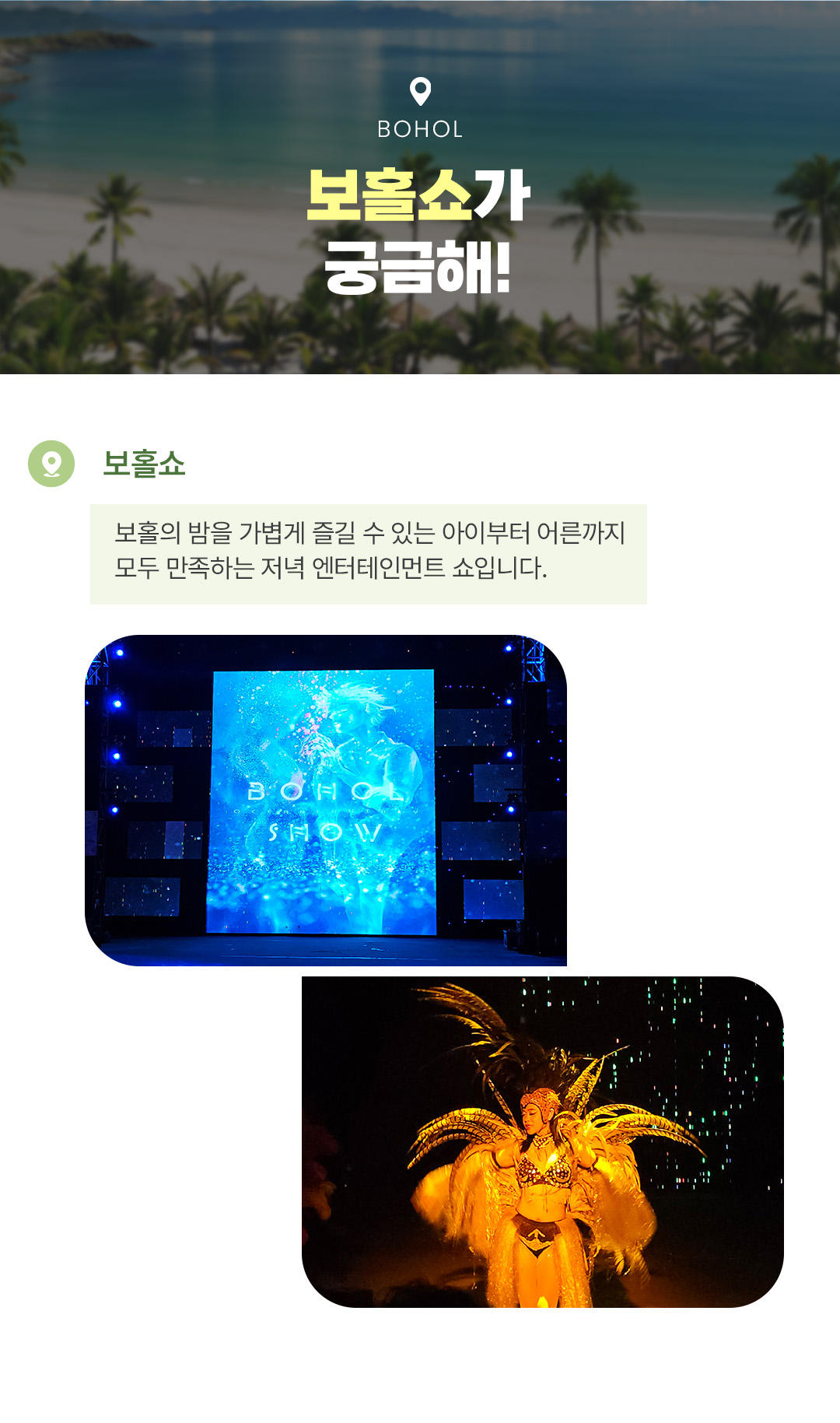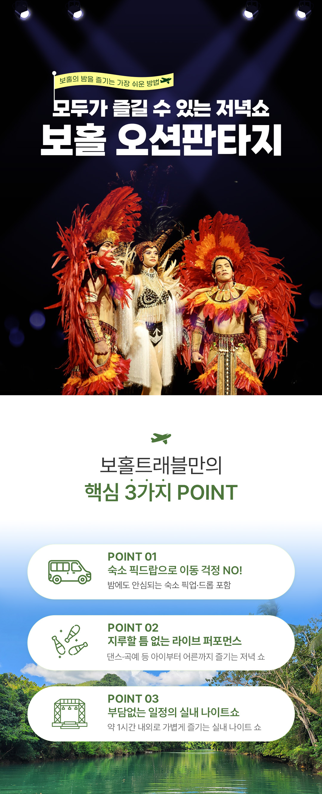 보홀 오션판타지 공연은 보홀의 유일한 쇼로, 다양한 퍼포먼스와 함께 독특한 스토리를 가지고 있는 쇼예요. 신기한 곡예로 눈이 즐겁고, 색다른 감동까지 전해줘서 보홀에 방문한다면 꼭 놓치지 말아야 할 공연이랍니다. 해당 상품에는 픽업 & 샌딩 서비스가 포함되어 있어서 빠르고 편안하게 쇼를 관람할 수 있어요.