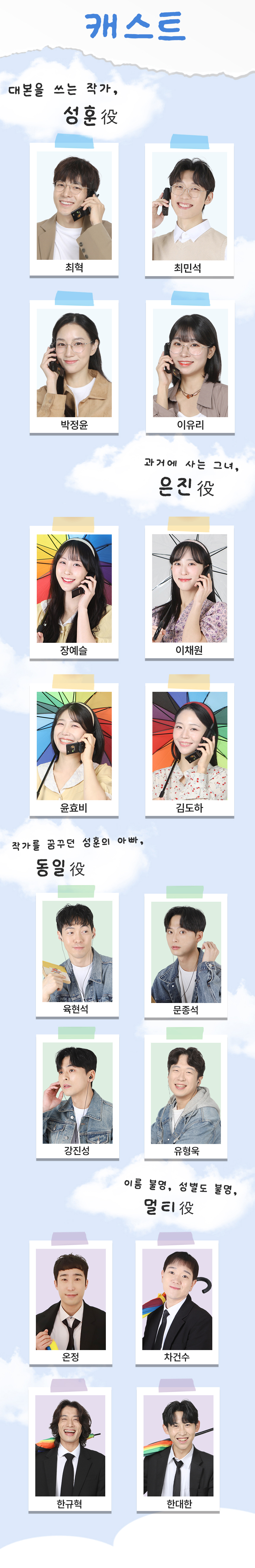 과거와 현재에 사는 두 주인공이 전화를 통해 소통하면서 시작되는 이 연극은, 대학로에서 남녀노소 할 것 없이 모든 관람객에게 사랑받고 있어요. 대학로 서연 아트홀에서 진행되는 이 연극은, 특유의 흔하지 않은 소재와, 관객들을 보는 내내 빵빵 터져 웃게 만드는 매력으로 무장하고 있어요. 과거와 현재를 오가며 타임슬립을 하는 주인공들을 보는 재미도 엄청나요. 보는 내내 마음이 편안해지는 힐링코미디 연극, 비누향기를 와그에서 만나보세요.