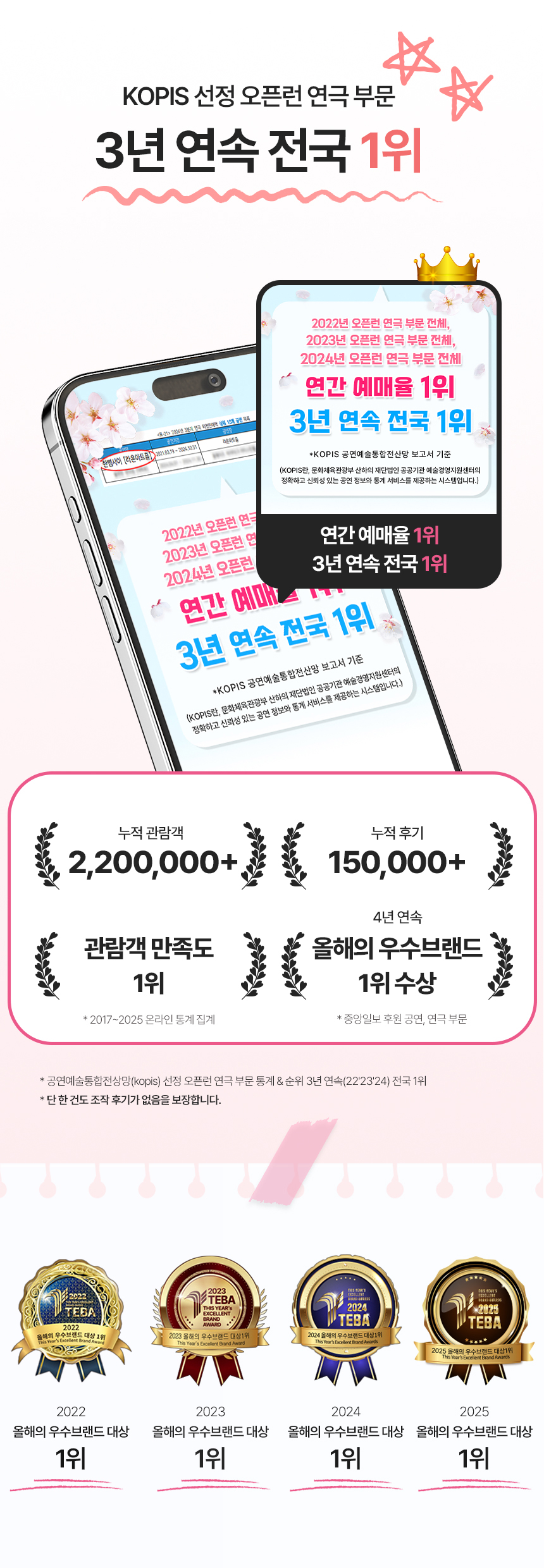 한뼘사이는 대학로 대표 커플메이킹 1위 연극이라는 별명을 가지고 있을 정도로 썸 타는 사이에도, 특별한 데이트를 원하는 연인에게도 추천하는 로맨틱 코미디 연극이에요. 연인인 듯, 친구인 듯, 한 뼘 사이를 두고 펼쳐지는 그들의 이야기를 감상하며 웃음 가득한 시간을 보내보세요.