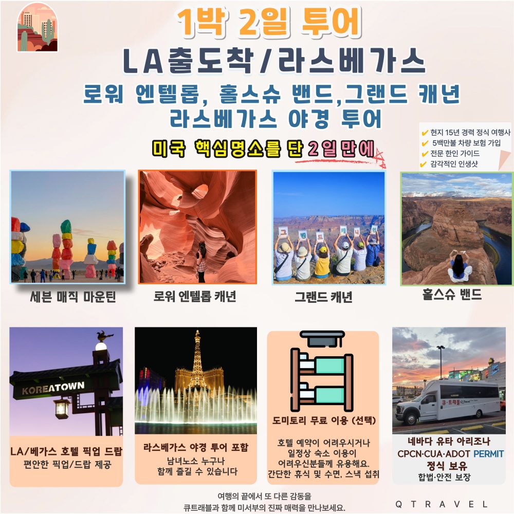 LA에서 출발해 미서부의 하이라이트를 모두 담은 완벽한 1박 2일 여행이에요. 웅장한 그랜드캐년, 신비로운 엔텔롭캐년, 자연이 빚어낸 홀스슈밴드를 감상하고, 화려한 라스베가스 야경까지 즐길 수 있어요. 밤이 되면 쏟아질 듯한 은하수를 바라보며 특별한 추억을 만들어보세요. 이동 중 차창 너머로 파웰 호수와 글렌 캐년 댐의 장관을 감상하며 미서부의 광활한 자연을 만끽할 수 있어요. 투어 종료 후 LA 숙소까지 안전하게 모셔다 드리며, 라스베가스 및 LA 한인타운/다운타운 픽업 서비스도 제공돼 더욱 편리해요.