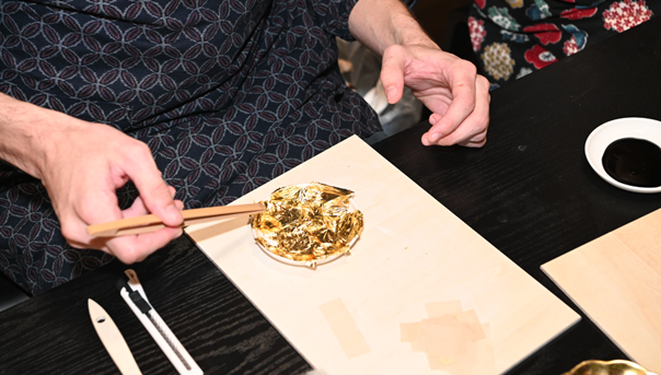 : 역사가 깊은 가나자와에서 생산되는 금박을 이용해서 작은 접시에 금박을 붙이는 체험이에요.
