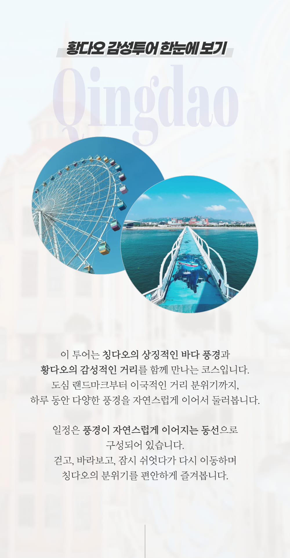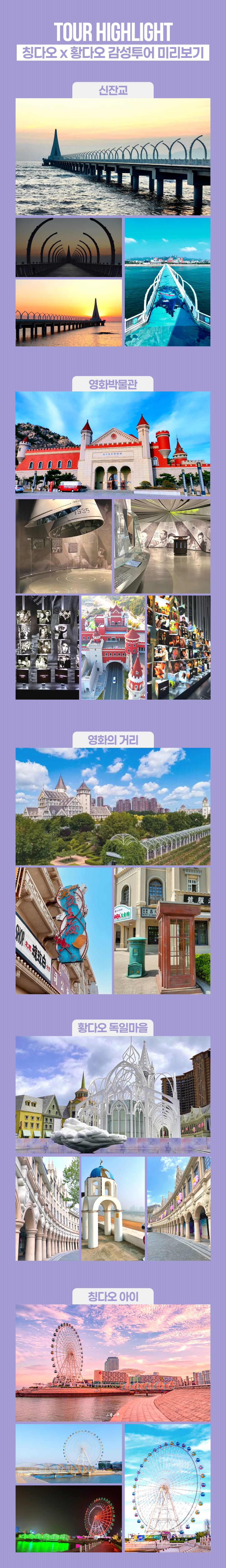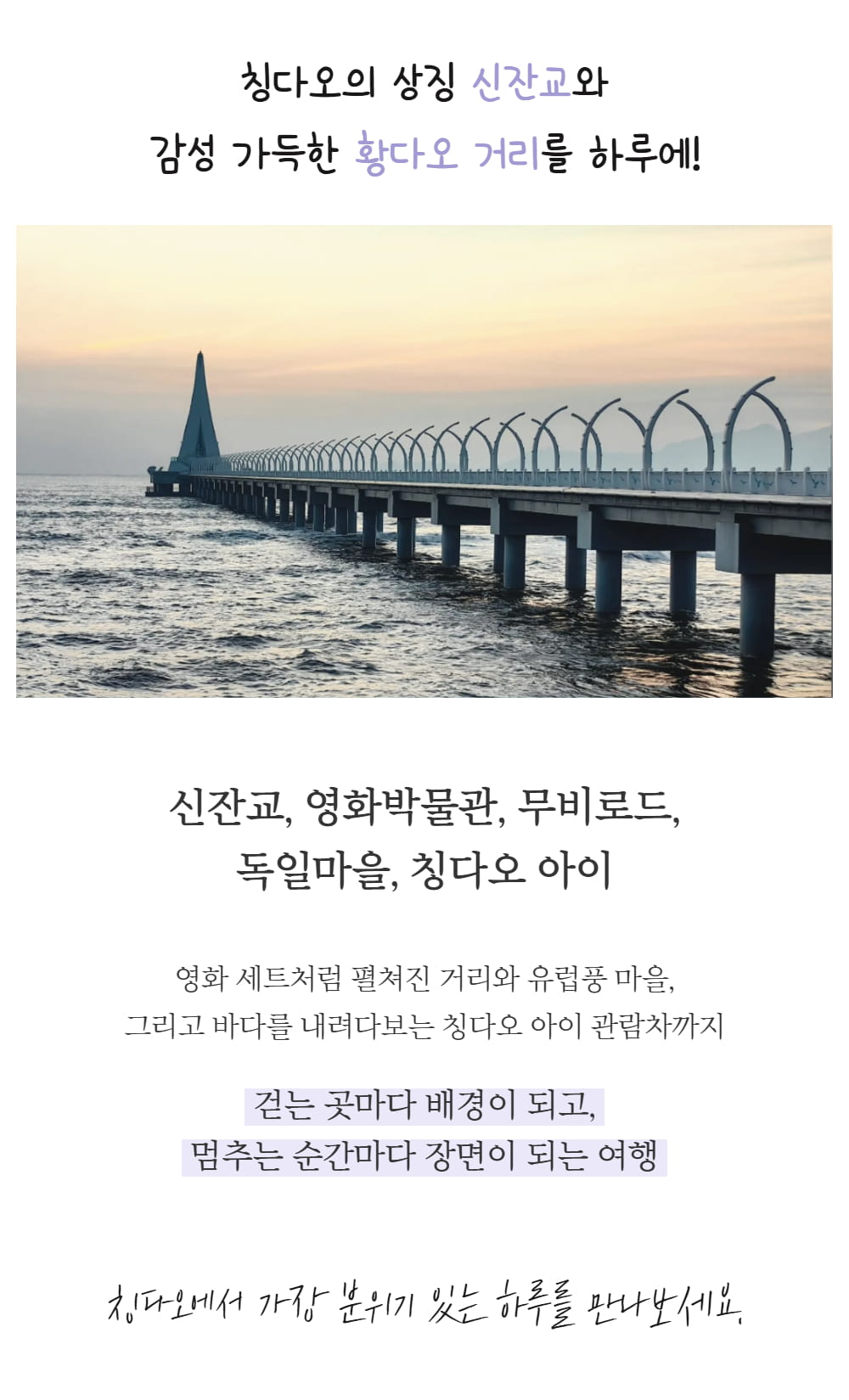 칭다오의 신도시, 황다오는 고풍스러운 풍경과 현대적인 도시의 풍경을 모두 가지고 있는 곳이에요. 먼저 바다 위로 뻗은 아름다운 신잔교를 구경하고, 세계 영화의 역사를 감상할 수 있는 영화박물관, 영화의 거리, 유럽의 느낌이 물씬 나는 독일 마을까지 다 둘러볼 거예요.