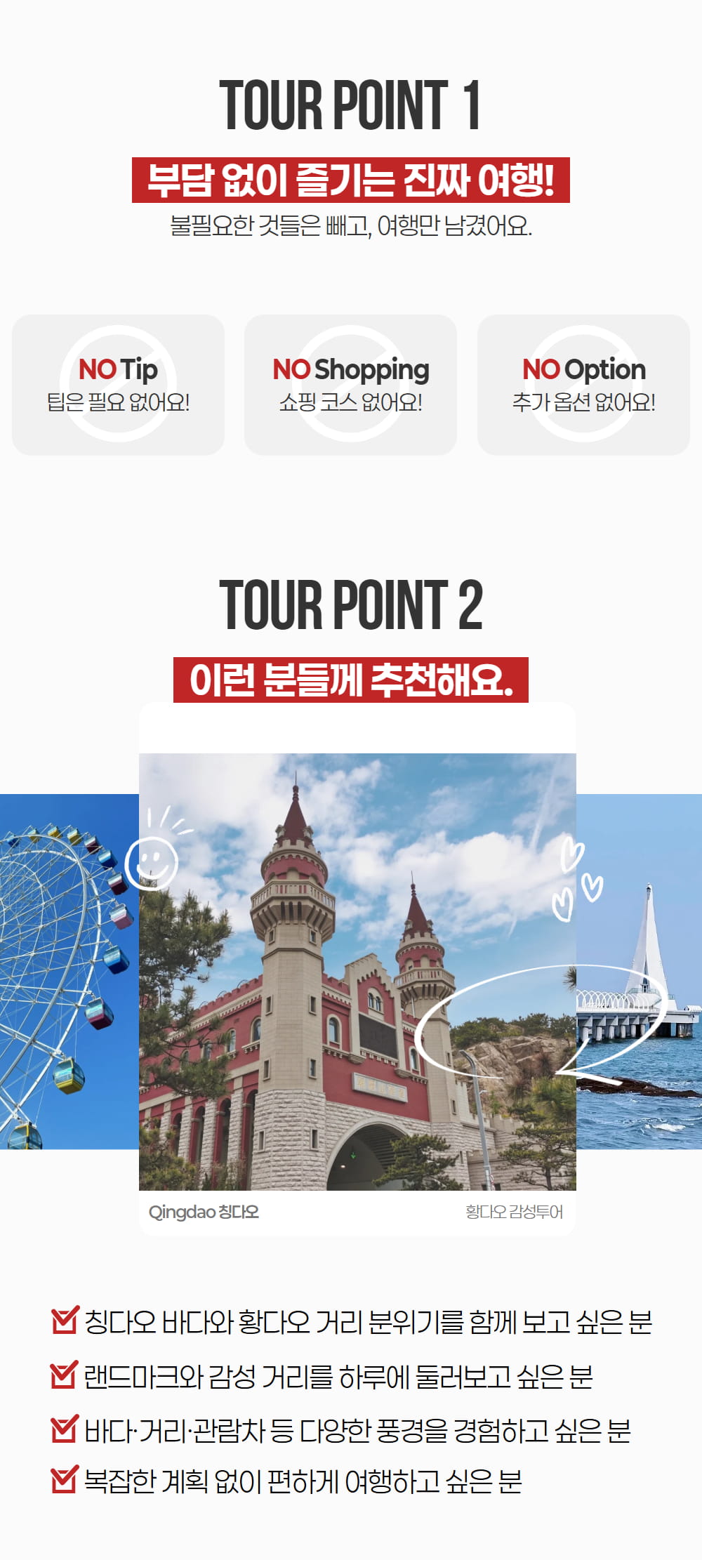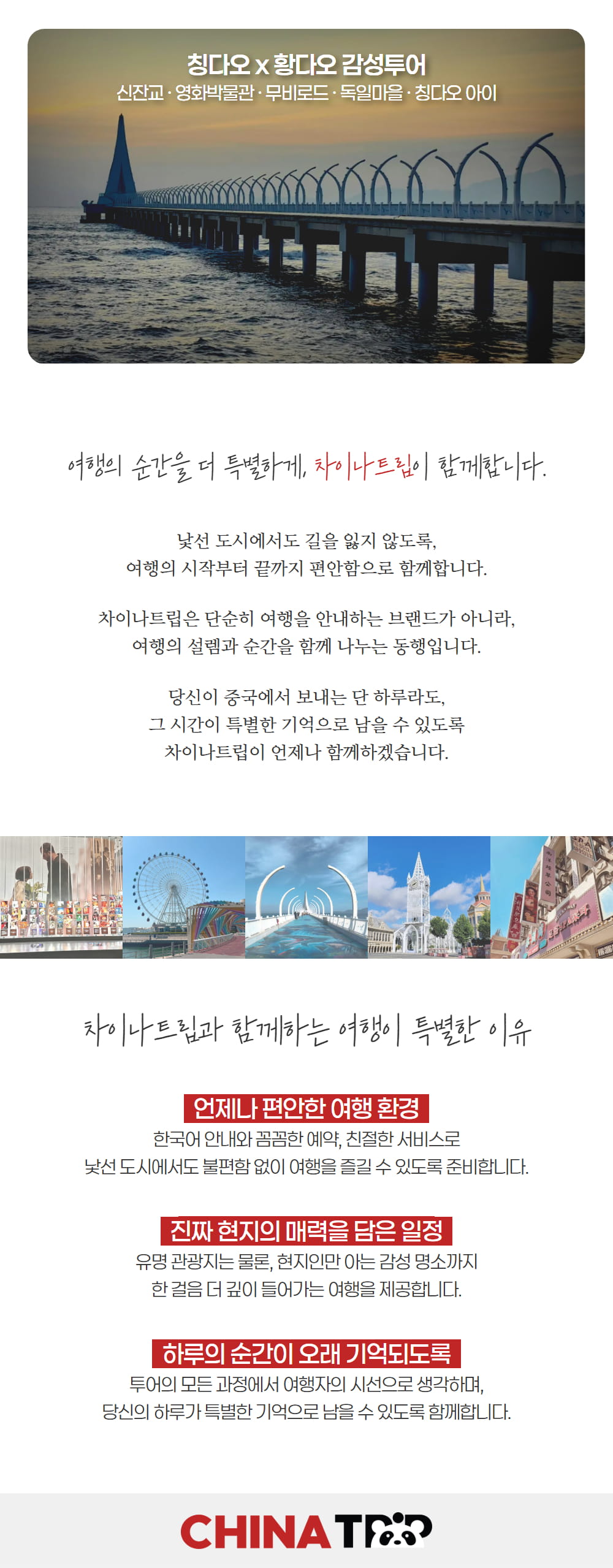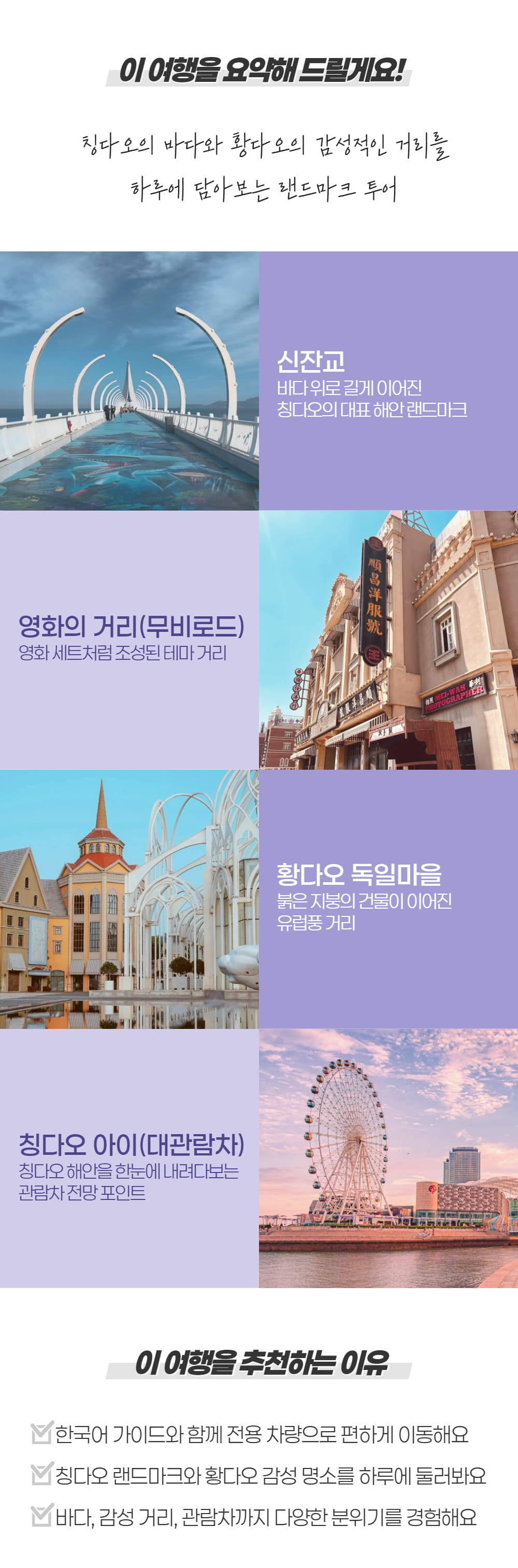 칭다오의 신도시, 황다오는 고풍스러운 풍경과 현대적인 도시의 풍경을 모두 가지고 있는 곳이에요. 먼저 바다 위로 뻗은 아름다운 신잔교를 구경하고, 세계 영화의 역사를 감상할 수 있는 영화박물관, 영화의 거리, 유럽의 느낌이 물씬 나는 독일 마을까지 다 둘러볼 거예요.