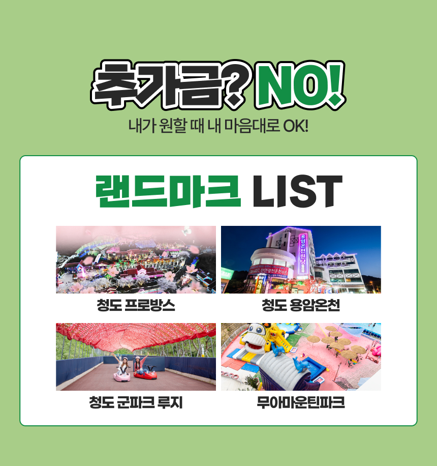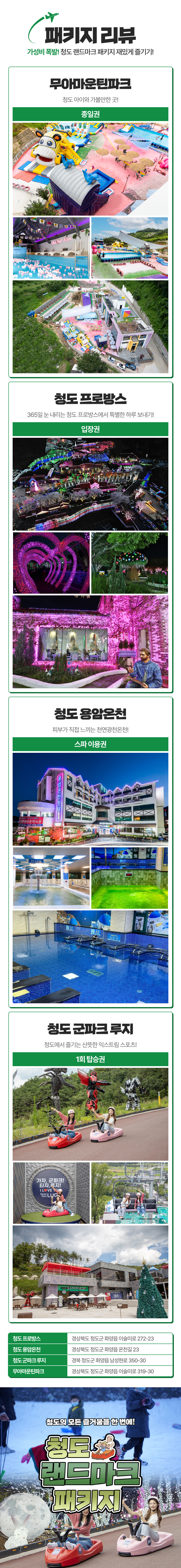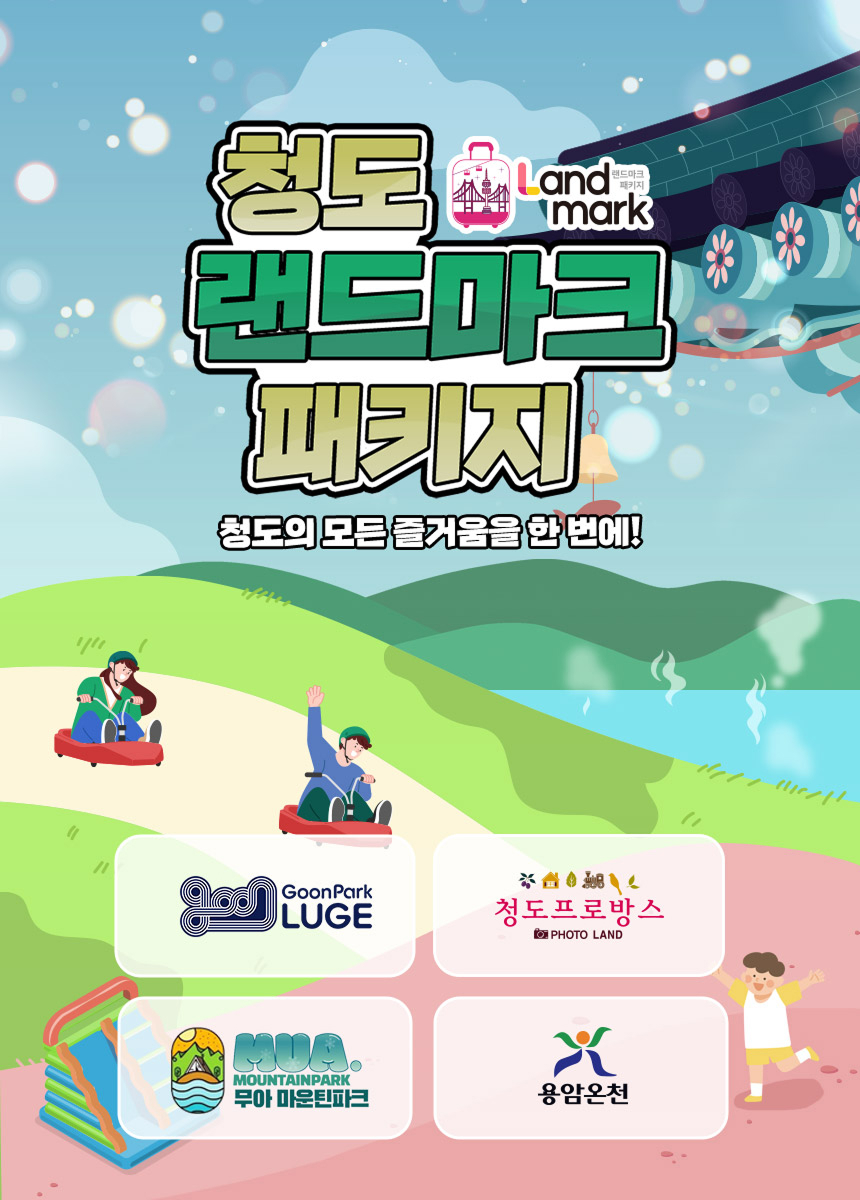 청도에서 보고 즐길 수 있는 것들을 알차게 모은 패키지를 소개할게요. 청도 랜드마크 패키지는 청도 프로방스, 천연 광천온천인 용암온천, 군파크 루지 등 청도의 대표 랜드마크를 가성비 있는 가격으로 즐길 수 있어요. 청도 랜드마크 패키지와 함께 알차고 즐거운 청도 여행을 즐겨보세요!
