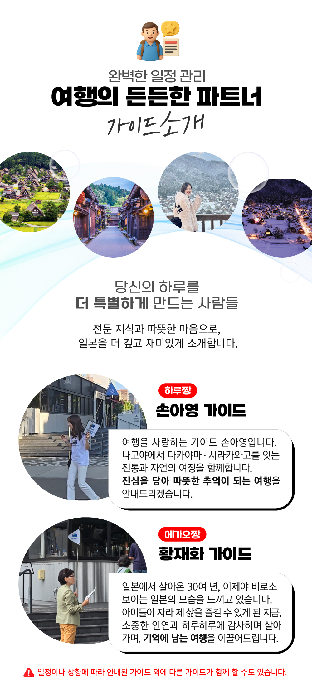 베스트히다 다카야마부터 시라카와고까지 알차게 묶여 있어서 나고야 근교 여행으로는 이 투어가 정답 같아요! 특히 '작은 교토'라 불리는 히다 다카야마 산마치 거리는 고풍스러운 분위기가 너무 좋았고요, 무엇보다 운전 걱정 없이 버스 안에서 꿀잠 자고 도착지마다 딱 필요한 시간만큼만 쓸 수 있게 일정이 잘 짜여 있어서 부모님 모시고 가기에도 딱이더라고요! 유튜어 진짜 추천합니다!