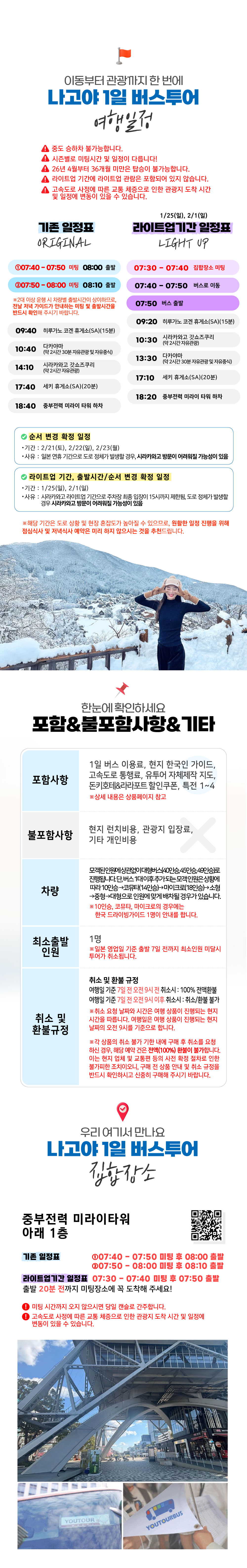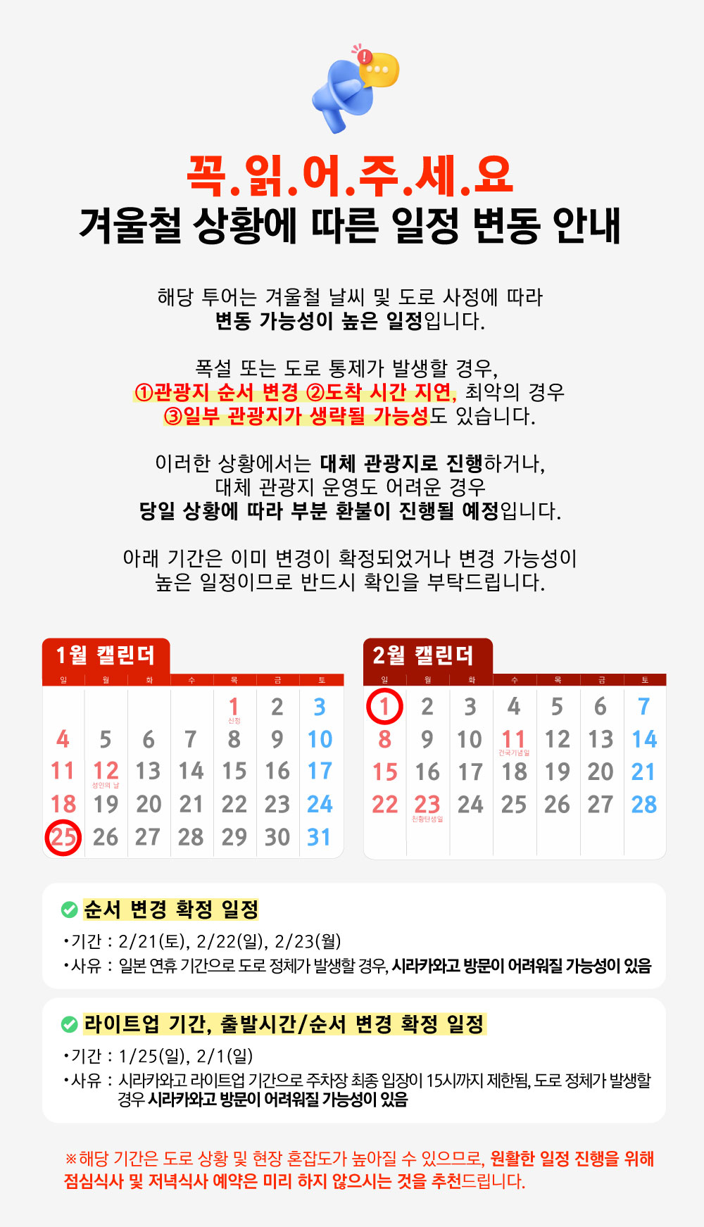 한국어 제공✅필독✅ <관광지 순서 변경 공지> 일본 현지 교통 혼잡 및 시라카와고 라이트업 행사 일정에 따라, 관광 순서가 다음과 같이 변경됩니다. ✅※ 해당 기간은 도로 상황 및 현장 혼잡도가 높아질 수 있으므로,원활한 일정 진행을 위해 점심식사 및 저녁식사 예약은 미리 하지 않으시는 것을 추천드립니다. ✨ 기존 순서: 다카야마 → 시라카와고 변경 순서: 시라카와고 → 다카야마 ✔[순서 변경 확정 일정] 1/25, 2/1 → 시라카와고 라이트업 일정 ・2/21~2/23(일본 현지 연휴 기간)