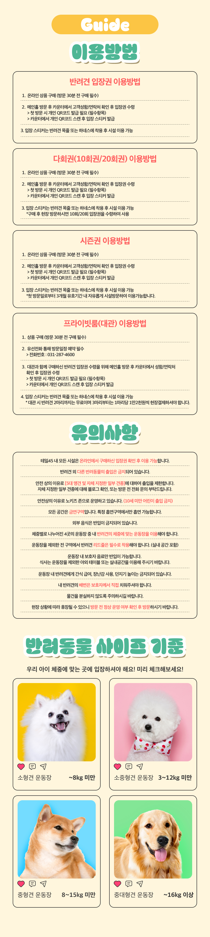 도시 생활하는 반려견들에게는 새롭고 유익한 시간이 되고, 모든 반려견이 운동량을 높이고, 사회성을 기를 수 있는 소중한 시간이 될 거예요!