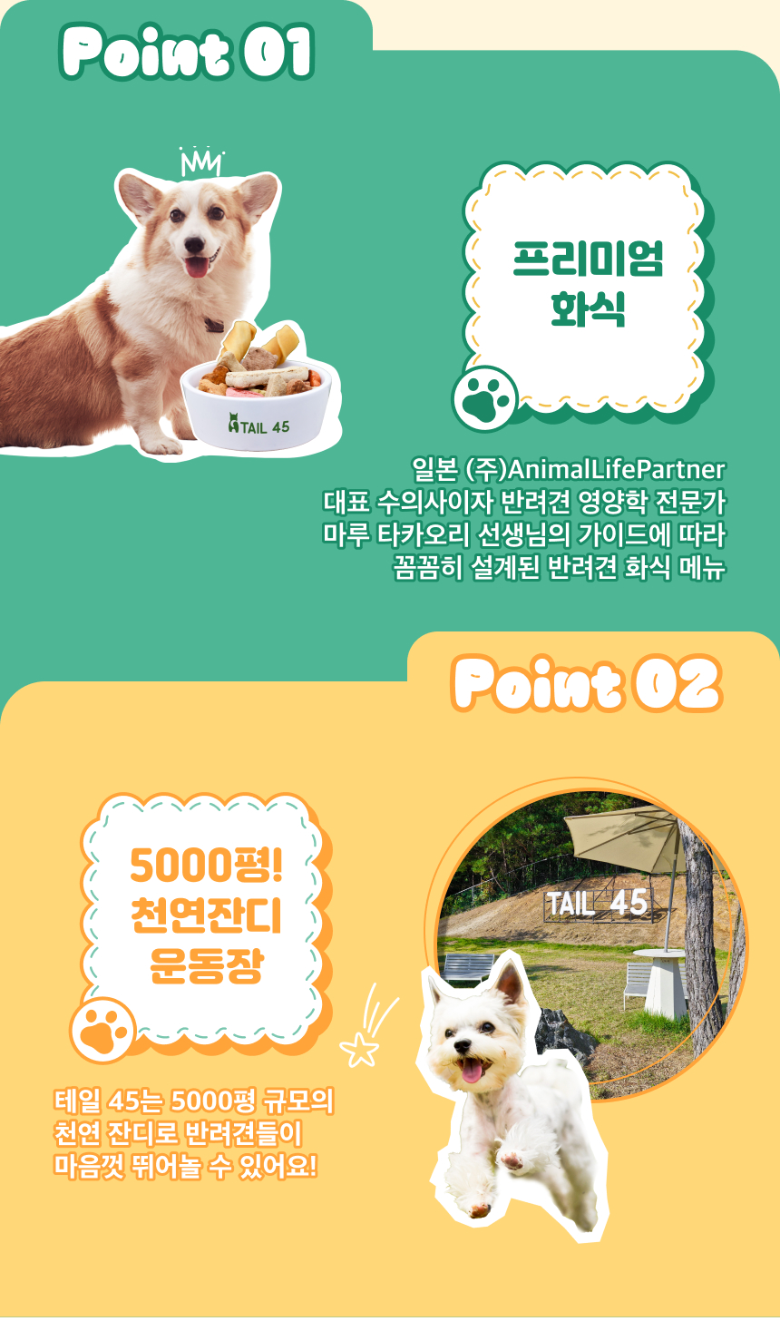 반려 가족을 위한 멀티 핫플레이스를 소개할게요! 경기도 용인의 테일45는 5,000평 규모의 천연 잔디 운동장이 있어 반려견들이 마음껏 뛰어놀 수 있는 공간이에요. 운동장뿐만 아니라, 일본 대표 수의사이자 반려견 영양학 전문가 마루 타카오리 선생님의 가이드에 따라 꼼꼼히 설계된 반려견 화식 메뉴가 제공돼요. 그리고 훈련사가 상시 상주하고 있어 매우 안전해요. 전문 훈련사가 제공하는 디테일한 보호자 동반 훈련 커리큘럼까지 있으니, 우리 강아지를 위한 모든 것이 준비되어 있어요!