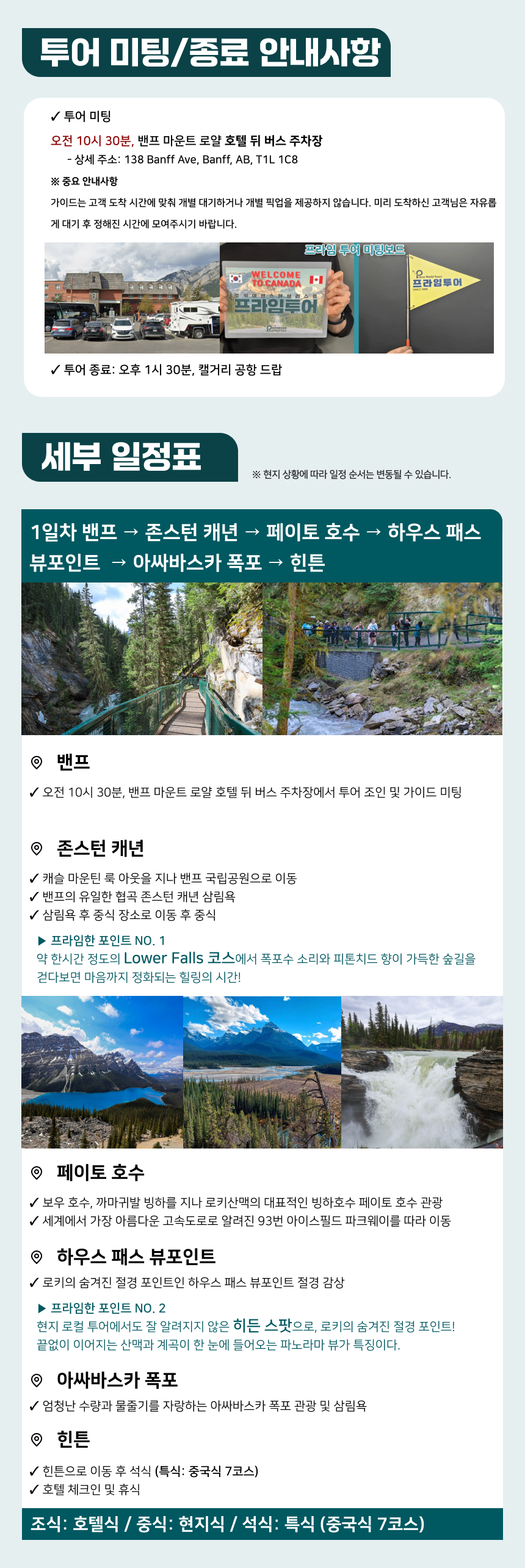밴프 타운과 그 주변의 매력적인 풍경들을 중심으로 진행되는 알찬 일정의 여행이에요. 투어 중에는 존스턴 캐년과 레이크 루이스 같은 대표적인 명소들을 방문해 로키 산맥의 장엄한 풍경을 직접 느낄 수 있어요! 밴프 타운은 고유의 전통적인 분위기와 모던한 느낌의 건축물들이 조화를 이루며, 다양한 상점과 맛집이 있어 산책하며 여유로운 시간을 보내기에 안성맞춤이에요. 투어 마지막 날에는 밴프에서 출발해 캘거리 공항으로 편리하게 이동할 수 있어요. 3박 4일 동안 짧지만 알찬 일정 속에서 캐나다 로키 산맥의 숨겨진 명소들을 한눈에 감상할 수 있는 특별한 기회를 놓치지 마세요!