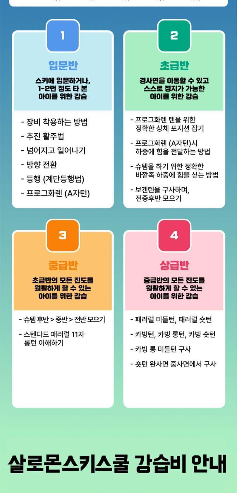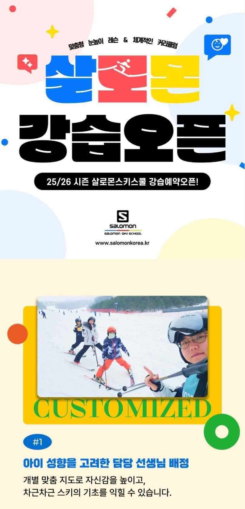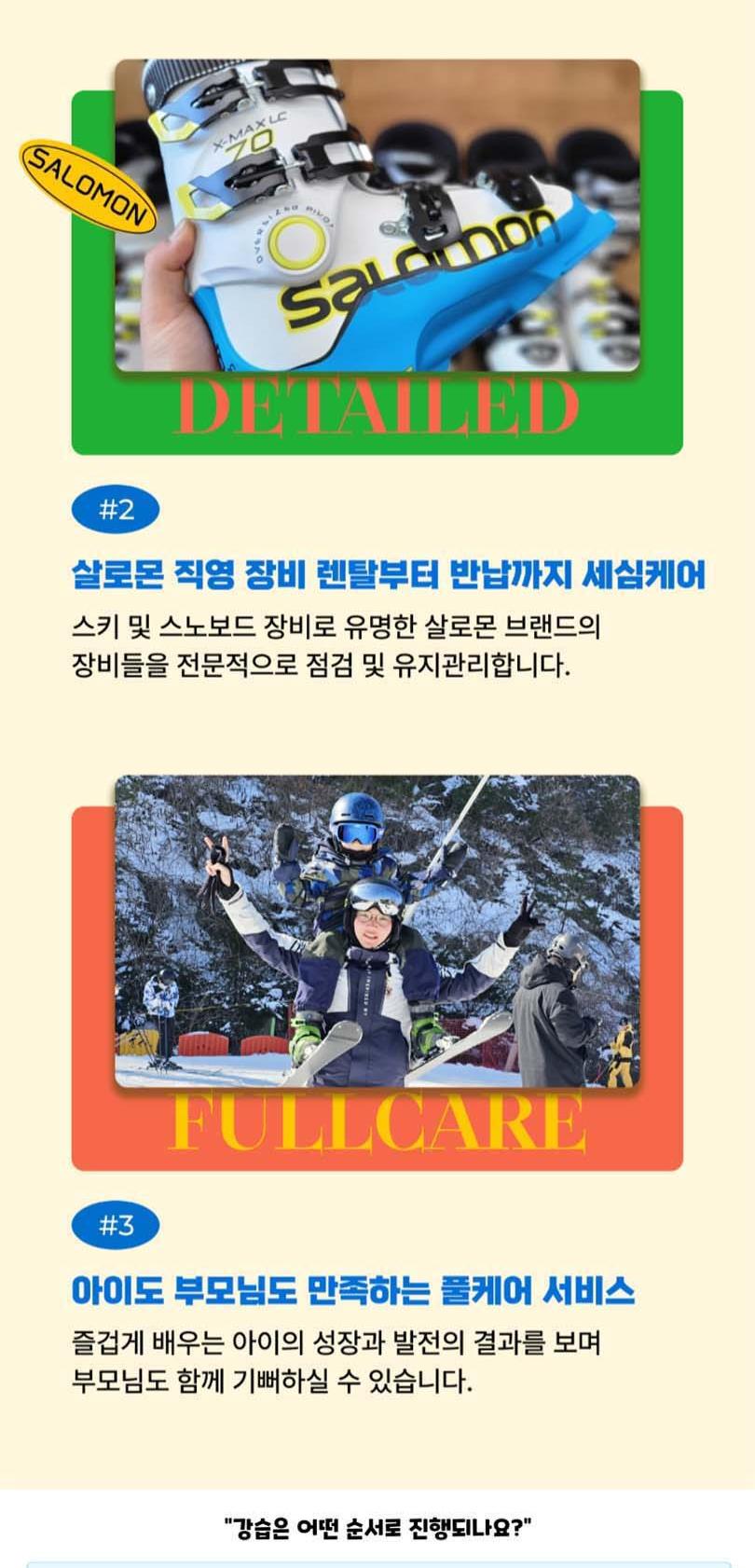 아이 성향을 고려한 담당 선생님이 배정되어 개별 맞춤 지도가 진행돼요. 아이들의 자신감을 높이고, 차근차근 스키의 기초를 익힐 수 있어요. 또한, 스키 및 스노보드 장비로 유명한 살로몬 브랜드의 장비들을 전문적으로 점검 및 유지 관리 해요. 렌탈부터 반납까지도 걱정 없이 모두 도와드려요! 강습 중에는 아이도 부모님도 만족하는 풀케어 서비스로, 아이들은 즐겁게 배우고, 부모님은 아이의 성장과 발전의 결과를 보며 함께 기뻐할 수 있어요.