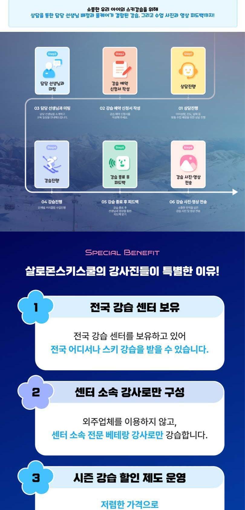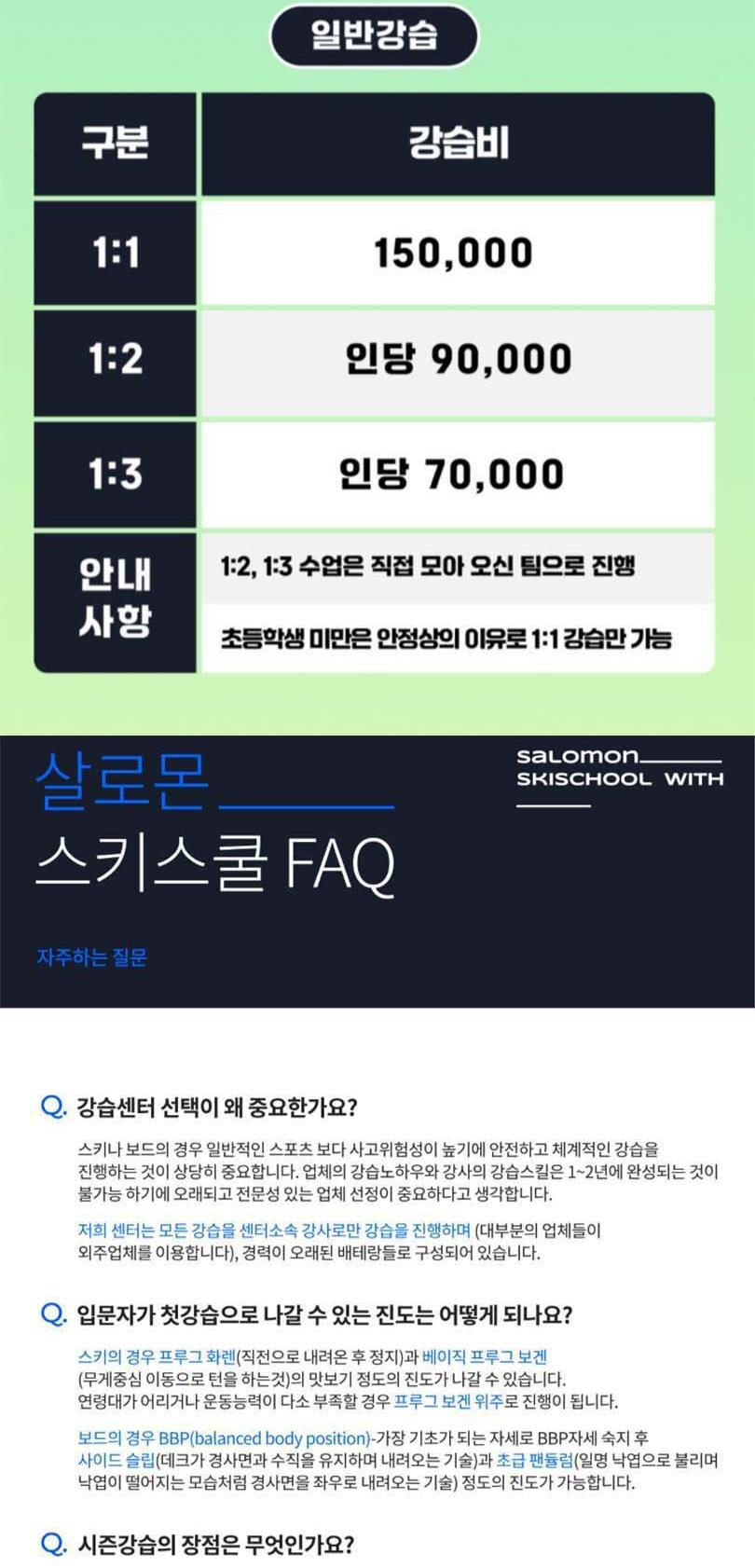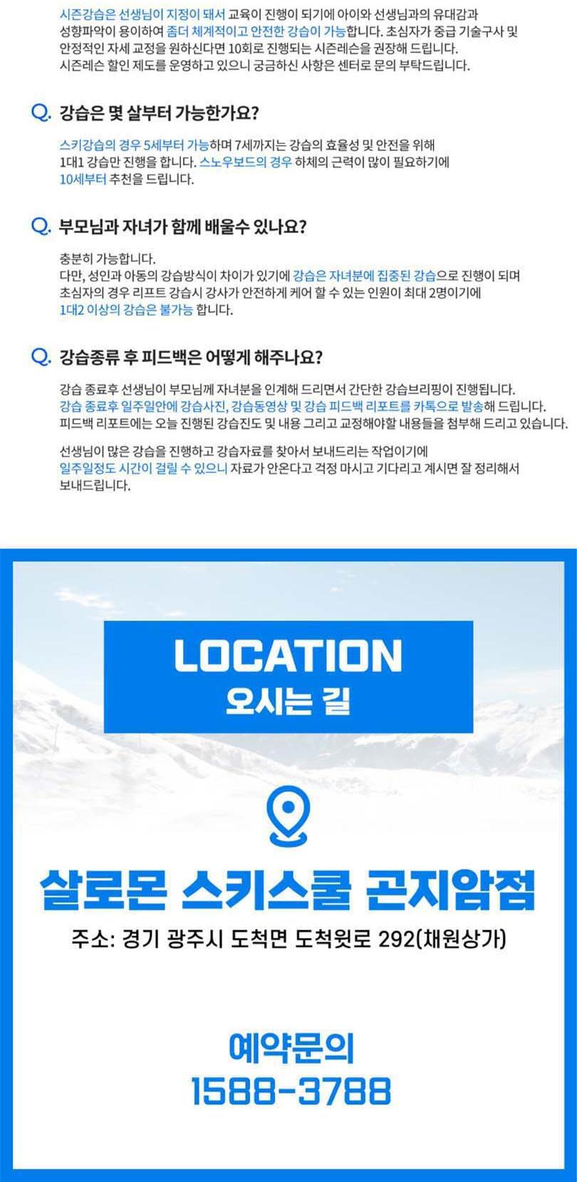 아이 성향을 고려한 담당 선생님이 배정되어 개별 맞춤 지도가 진행돼요. 아이들의 자신감을 높이고, 차근차근 스키의 기초를 익힐 수 있어요. 또한, 스키 및 스노보드 장비로 유명한 살로몬 브랜드의 장비들을 전문적으로 점검 및 유지 관리 해요. 렌탈부터 반납까지도 걱정 없이 모두 도와드려요! 강습 중에는 아이도 부모님도 만족하는 풀케어 서비스로, 아이들은 즐겁게 배우고, 부모님은 아이의 성장과 발전의 결과를 보며 함께 기뻐할 수 있어요.
