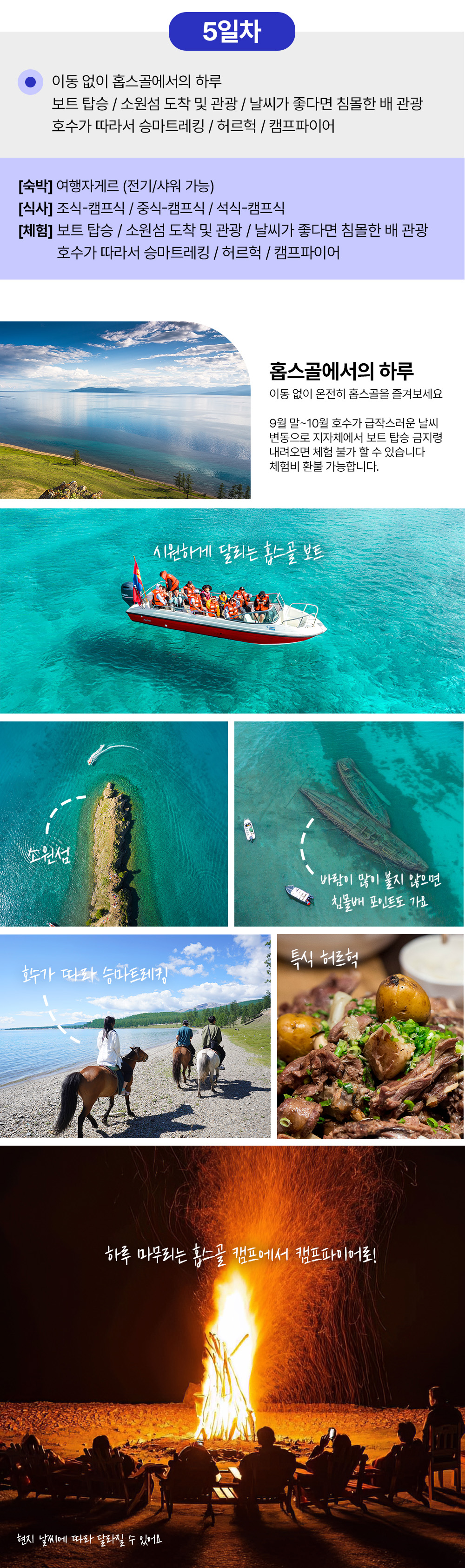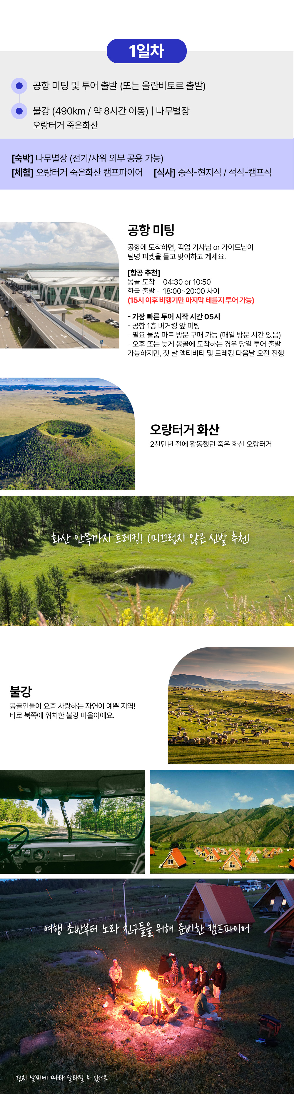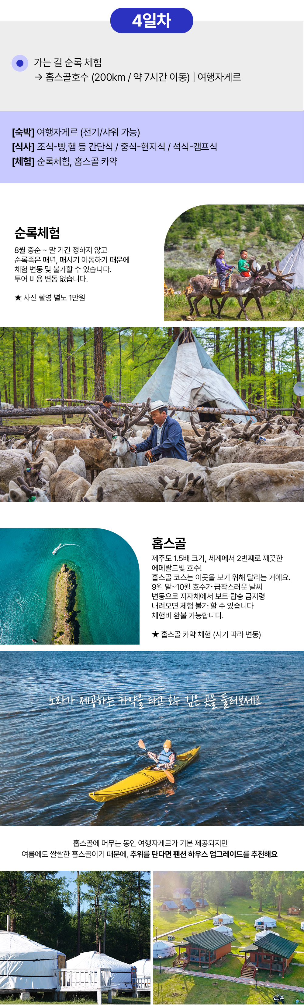 이 투어에서는 울란바토르에서 가장 가까운 미니사막 지대인 엘승타사르하이와 푸른 진주라는 별명을 가진 홉스골 호수를 방문해요. 이 투어는 단독 차량과 숙박, 식사가 포함되어 있어 편리하고 편안한 여행을 즐길 수 있어요. 매일 제공되는 맛있는 식사와 안전하고 쾌적한 숙소에서의 휴식 시간과 함께 몽골 여행을 더욱 특별하게 만들어 보세요!