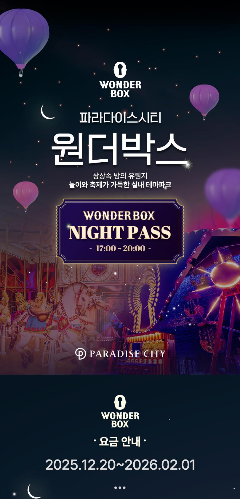 파라다이스시티 원더박스 나이트패스와 함께 화려한 조명 아래 펼쳐지는 축제의 밤을 만끽하고, 다양한 볼거리와 즐길 거리로 가득 찬 특별한 추억을 가득 담아 가세요!