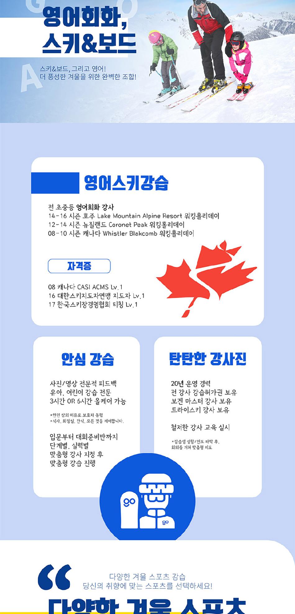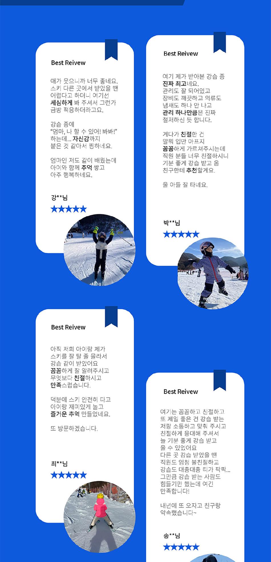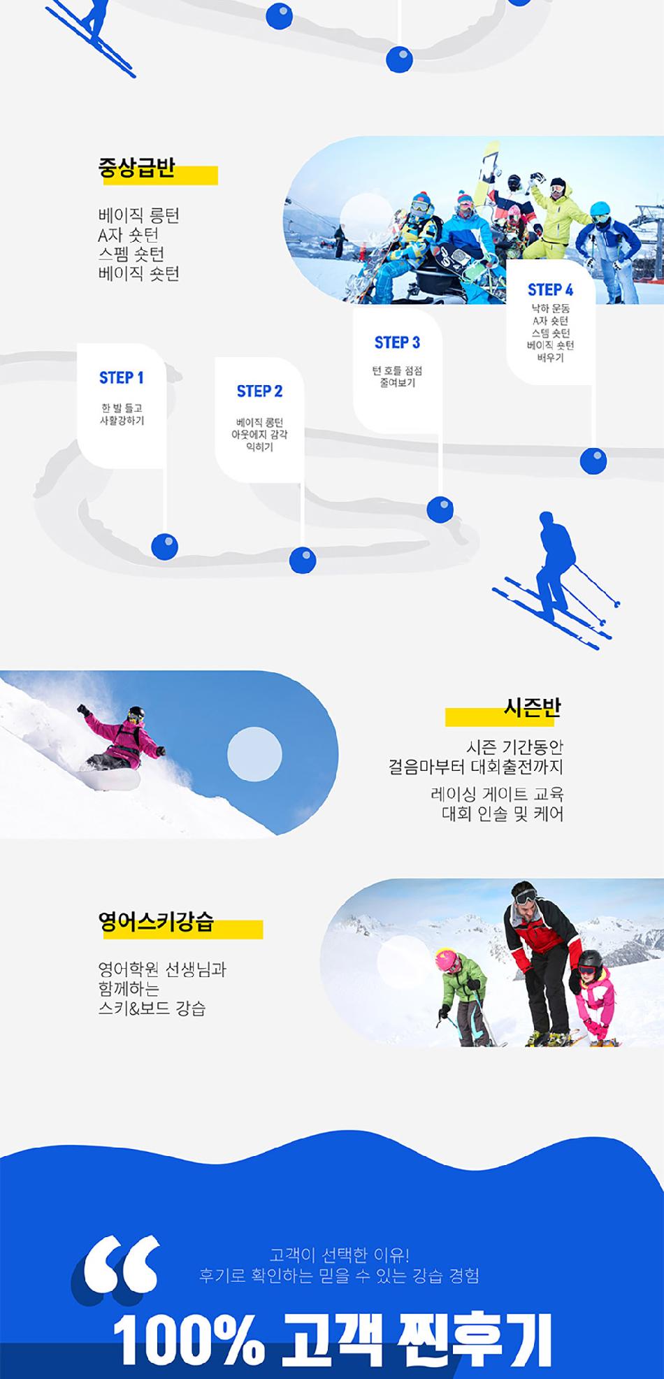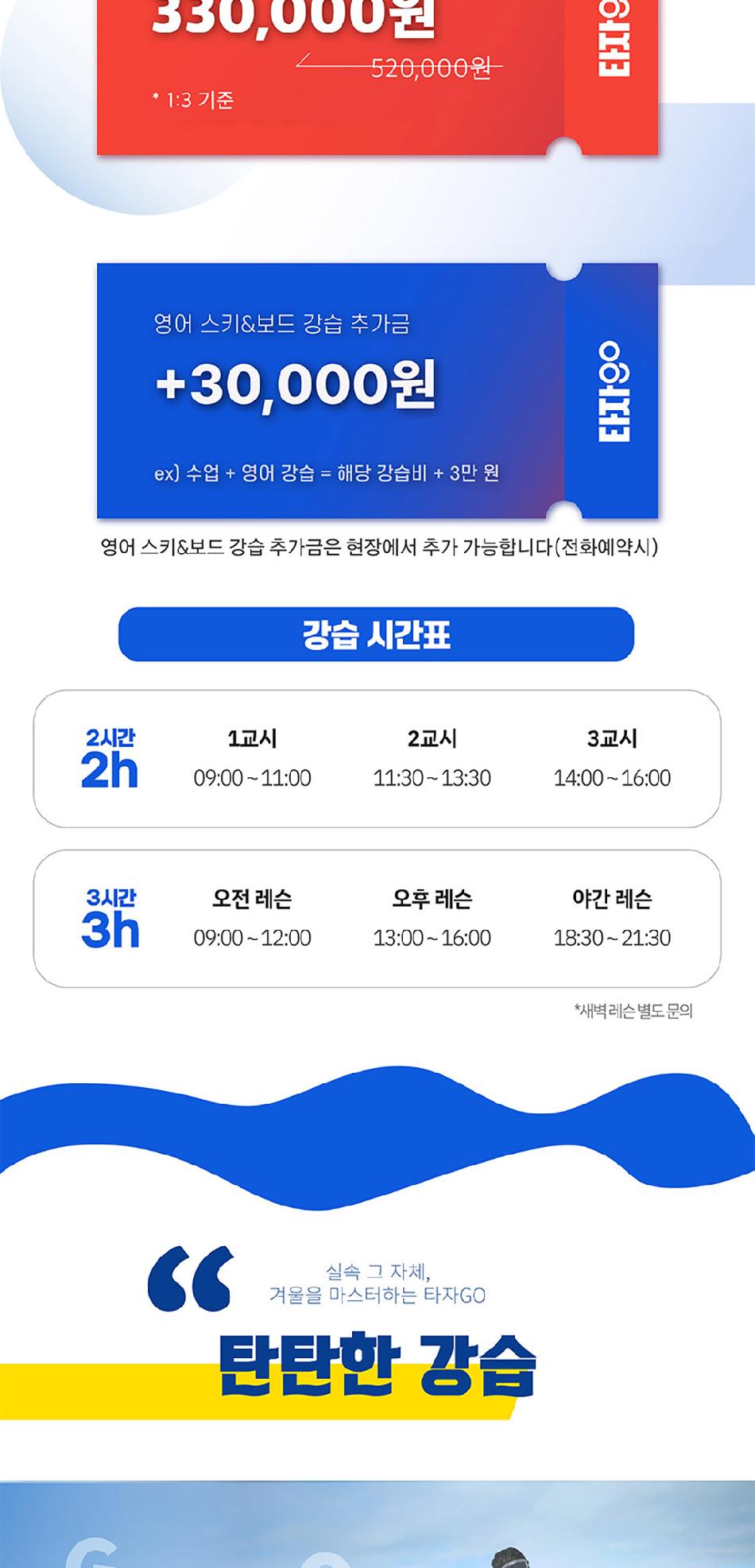경험 많은 강사진과 함께 맞춤형 프로그램으로 스키와 보드를 배울 수 있음은 물론이며, 초중고 영어학원 강사와 함께 영어 회화까지 배울 수 있어요. 20년 운영 경력과 함께 전 강사가 강습 허가권을 보유하였으며 보겐 마스터 강사, 트라이스키 강사까지 있어요. 게다가 유아, 어린이 강습 전문가가 함께 올케어를 진행한다고 하니 더욱 안심돼요. 사진과 영상으로 전문적 피드백까지 제공하니 더욱 체계적인 강습이 가능한 무주 타자고에서 겨울 스포츠를 마스터해보세요!