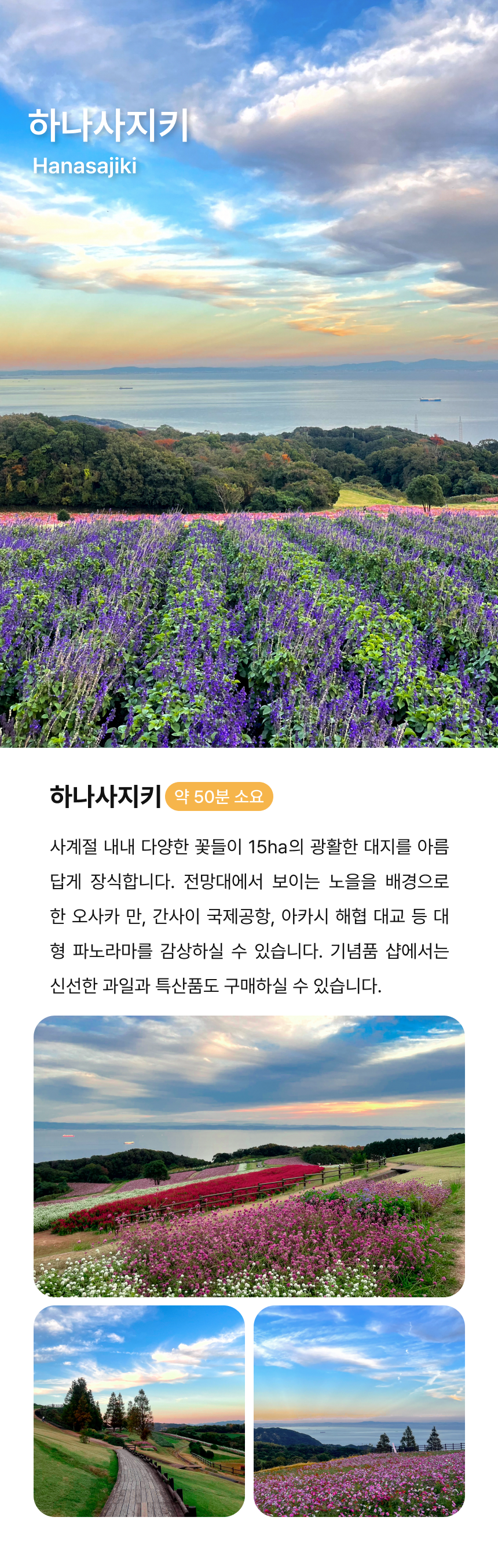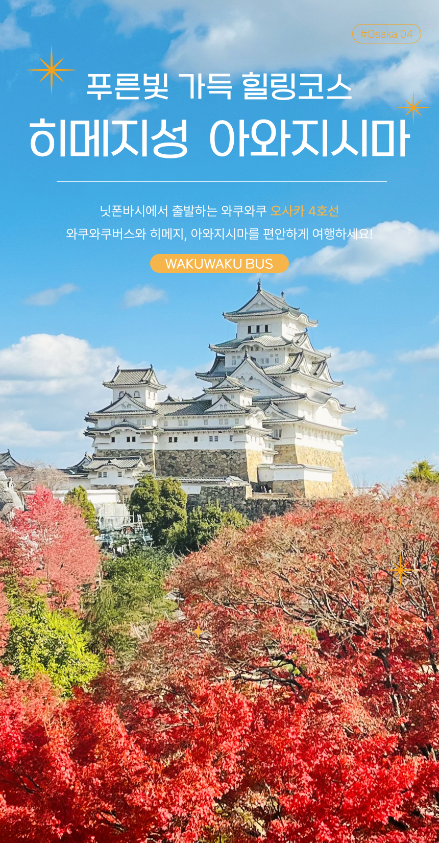 와쿠와쿠버스 오사카 4호선은 유네스코에 등록된 문화유산 히메지성과 아와지시마의 아름다운 자연과 전통을 만끽할 수 있는 코스로 준비되어 있어요. 일본에서 현존하는 가장 오래된 성, 히메지성과 푸른 바다를 감상할 수 있는 하이웨이 오아시스, 오사카만과 간사이 국제공항을 배경으로 펼쳐진 광활한 꽃밭 하나사지키까지 하루만에 모두 만나보세요!