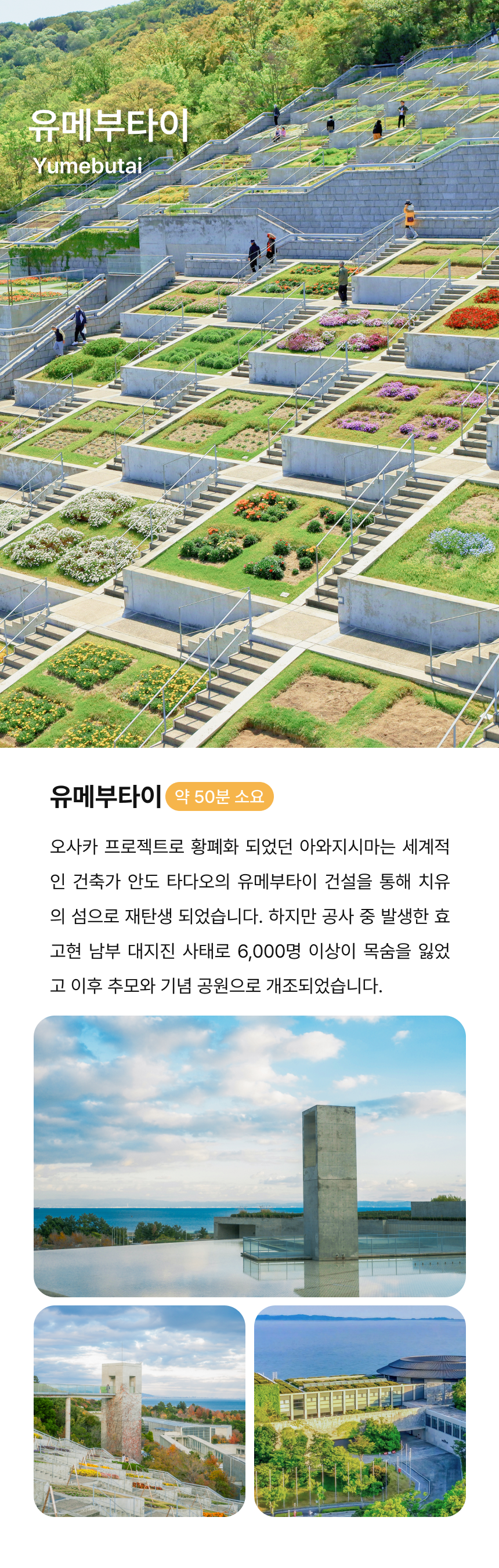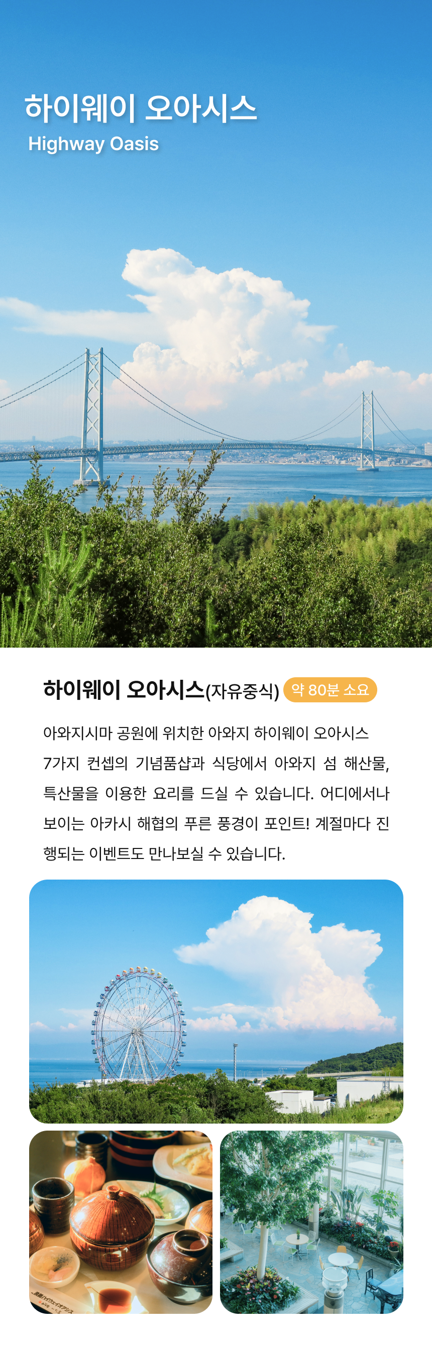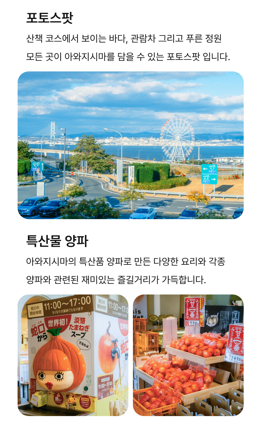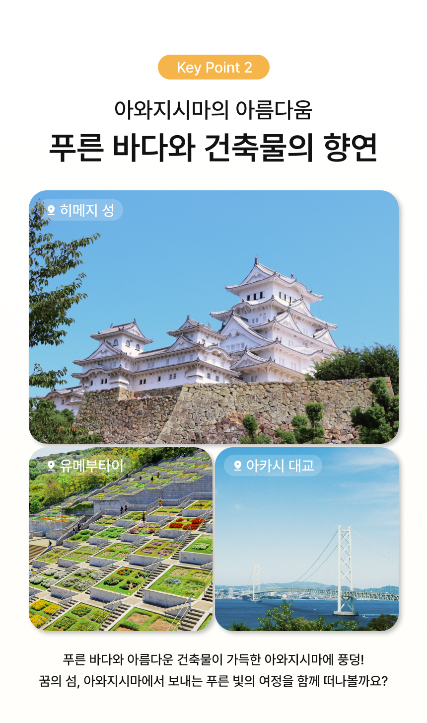오사카에서 출발해 히메지에서 아름다운 자연과 다양한 볼거리를 보고, 맛있는 음식을 즐길 수 있는 매력적인 섬, 아와지시마로 떠나볼까요?