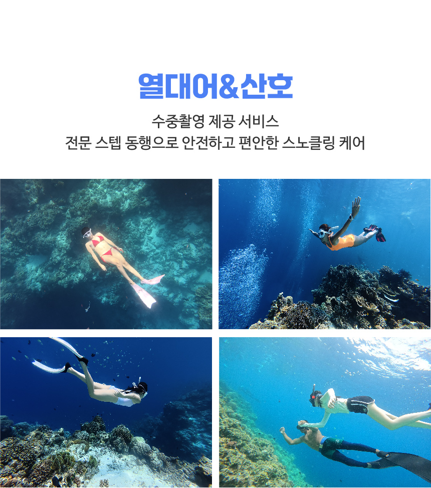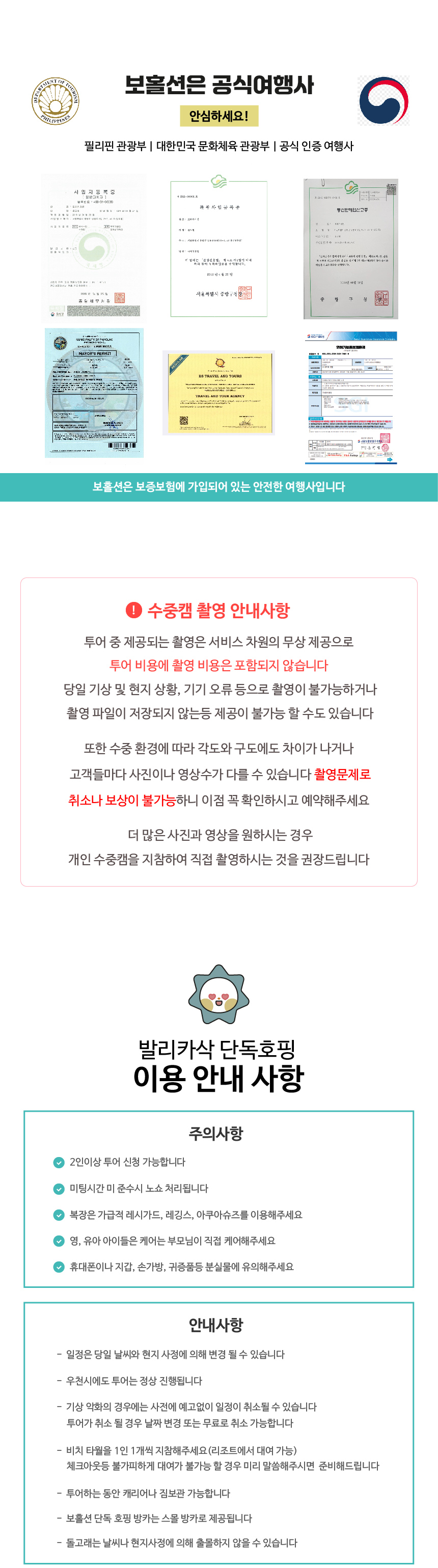 보홀에서 짜릿한 해양 액티비티를 즐겨보세요! 미친 텐션의 선상 레크리에이션, 팀별 전담 가이드의 인생샷 촬영 & 맞춤 케어, 최소 2회 이상 보장되는 스노클링까지! 팡라오 지역 무료 픽업 & 드랍 서비스로 시작부터 끝까지 편안하고 세심한 가이드를 제공해드려요.