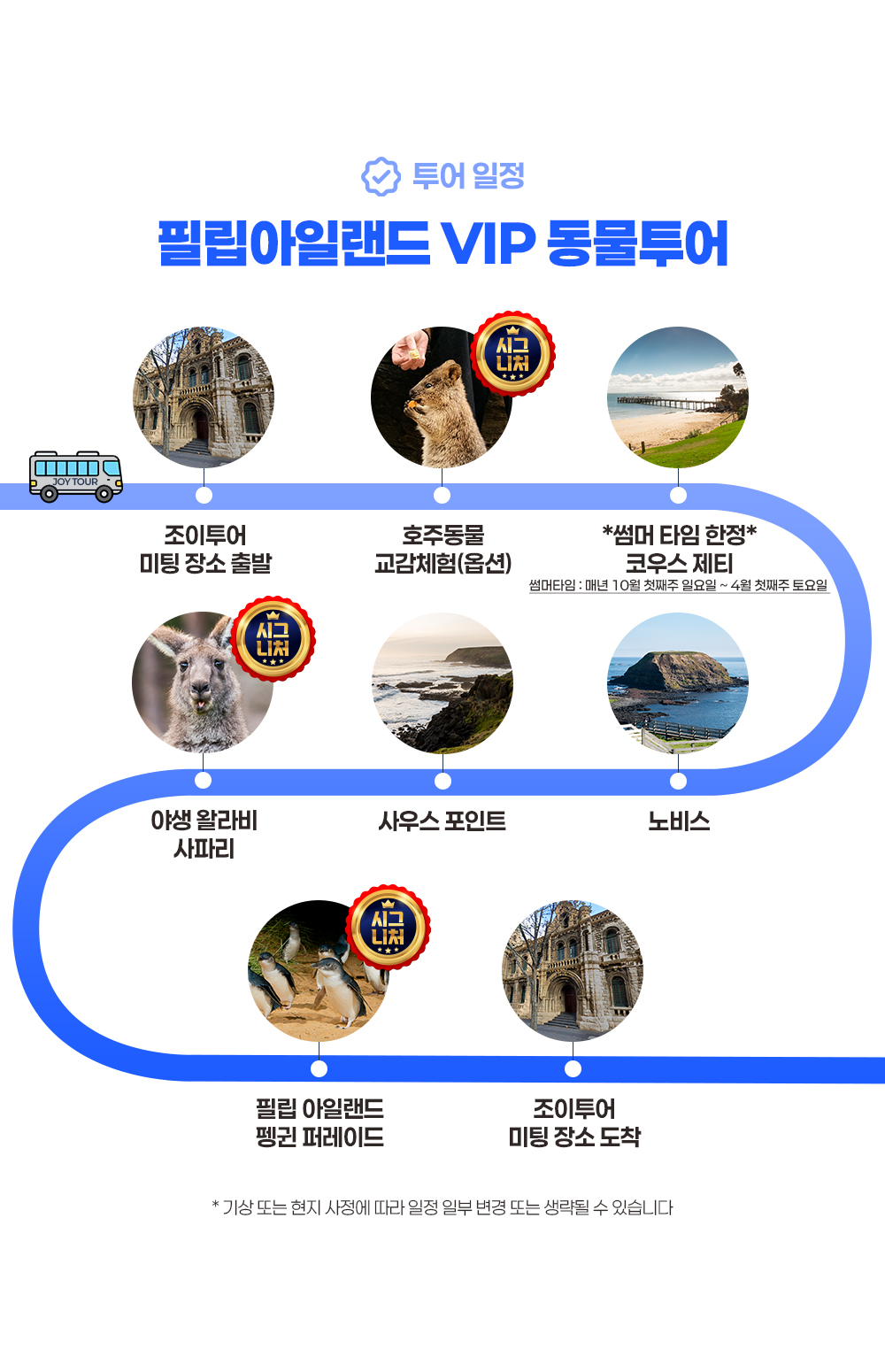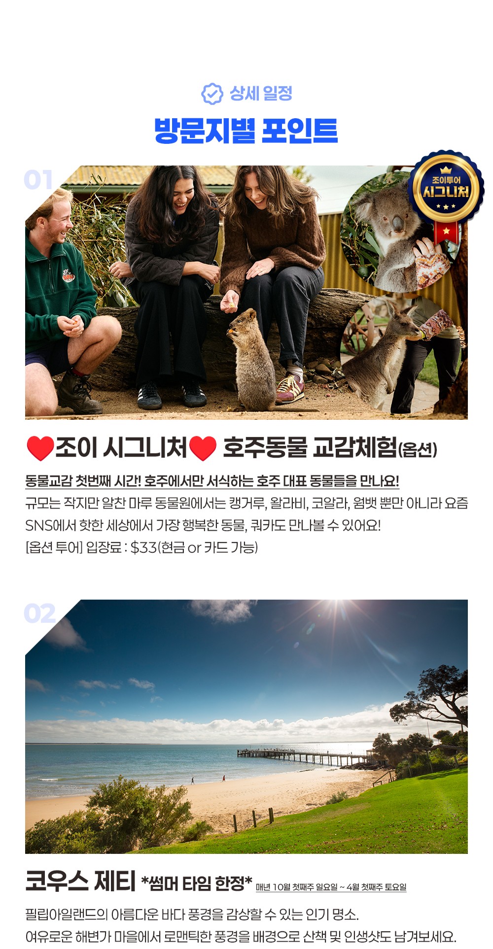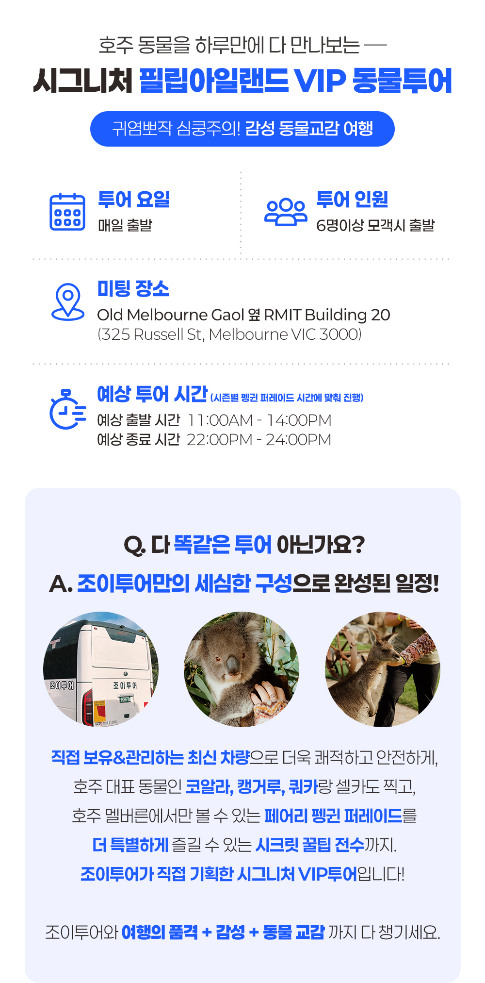 필립 아일랜드의 황홀한 오후를 만끽할 수 있는 반일 투어예요. 멜버른 최고의 가성비 투어를 만나 보세요. 안전성과 전문성, 최저가, 최상의 투어와 서비스를 제공해요. 펭귄과 호주 동물을 모두 만나 교감해 보세요. 마루동물원에서 귀여운 동물들을 가까이서 만나고, 노비스와 사우스포인트의 아름다운 해안선을 따라 펼쳐지는 드라마틱한 풍경을 감상해요. 이어지는 야생 왈라비 사파리에서는 자연 그대로의 야생동물을 체험하고 은하수 아래에서 펼쳐지는 펭귄 퍼레이드로 하루를 마무리해요. 이 매혹적인 일정은 도시의 번잡함을 잊게 해주고, 필립 아일랜드의 신비로운 자연과 함께하는 특별한 추억을 만들어 줄 거예요.