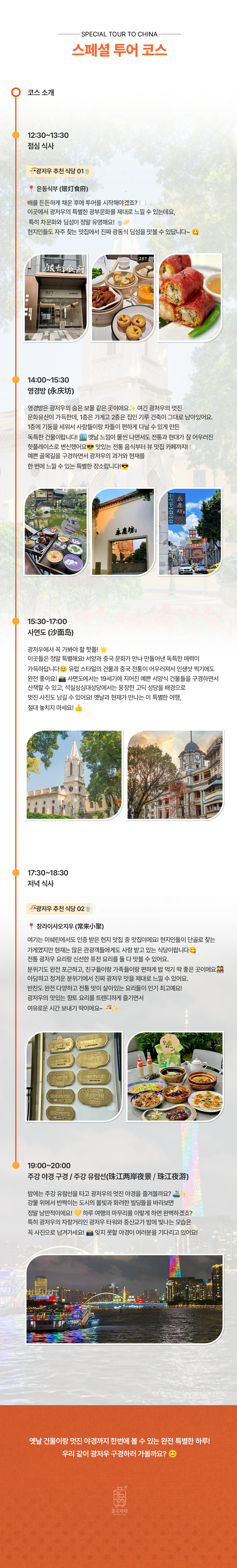 한국어 제공,중국어 제공2200년의 깊은 역사를 품은 도시, 광저우 에서 전통과 현대가 공존하는 특별한 하루를 만나보세요. ‘남쪽의 관문’이라 불리는 이곳은 빠르게 성장한 경제 중심지이면서도, 오랜 시간 이어진 문화와 분위기를 동시에 느낄 수 있는 매력적인 도시예요. 뻔한 관광 코스 대신, 현지 메이트가 직접 추천하는 진짜 인기 스팟들을 따라가며 광저우의 숨은 매력을 발견해보세요. 활기 넘치는 거리와 감성적인 공간, 그리고 현지 분위기가 가득한 장소들을 둘러보며 여행의 재미를 한층 더 끌어올려드립니다. 한국어가 가능한 현지 메이트가 동행해 언어 걱정 없이 편안하게 여행을 즐길 수 있으며, 필요한 입장권도 미리 준비되어 대기 없이 효율적인 관광이 가능해요. 알차고 재미있게, 그리고 특별하게 광저우를 경험하고 싶다면 지금 바로 떠나보세요.