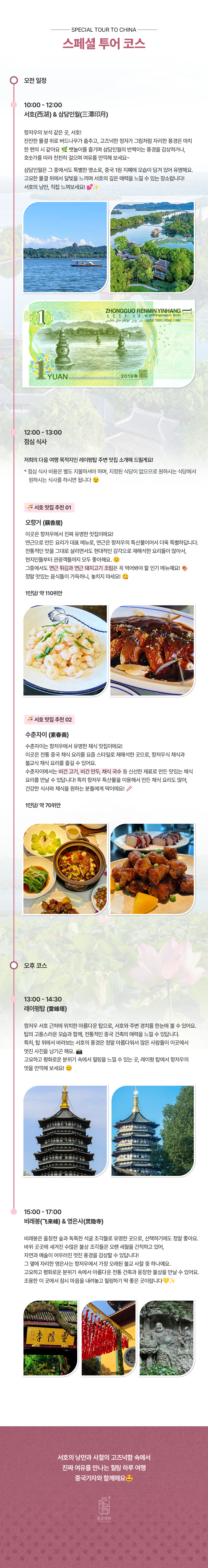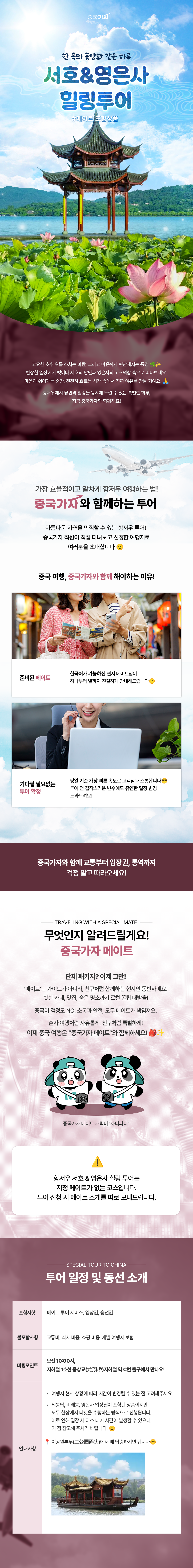 한국어 제공,중국어 제공바쁜 일상에서 잠시 벗어나, 고요한 풍경 속에서 진짜 여유를 만나보세요. 잔잔한 호수 위로 부는 바람과 함께 마음까지 편안해지는 서호 의 낭만, 그리고 천년의 시간을 품은 영은사 의 고즈넉한 분위기까지 하루에 모두 담아낸 힐링 코스예요. 서호를 따라 천천히 걷다 보면 어느새 마음이 차분해지고, 영은사의 웅장하면서도 평온한 공간에서는 자연스럽게 생각을 비우게 됩니다. 번잡한 관광이 아닌, ‘쉬어가는 여행’을 원한다면 가장 잘 어울리는 일정이에요. 한국어가 가능한 현지 메이트가 동행해 언어 걱정 없이 편안하게 여행을 즐길 수 있으며, 우리 일행만을 위한 프라이빗 일정으로 더욱 여유롭고 깊이 있는 시간을 보낼 수 있습니다. 오늘 하루, 항저우에서 가장 평온한 순간을 경험해보세요.