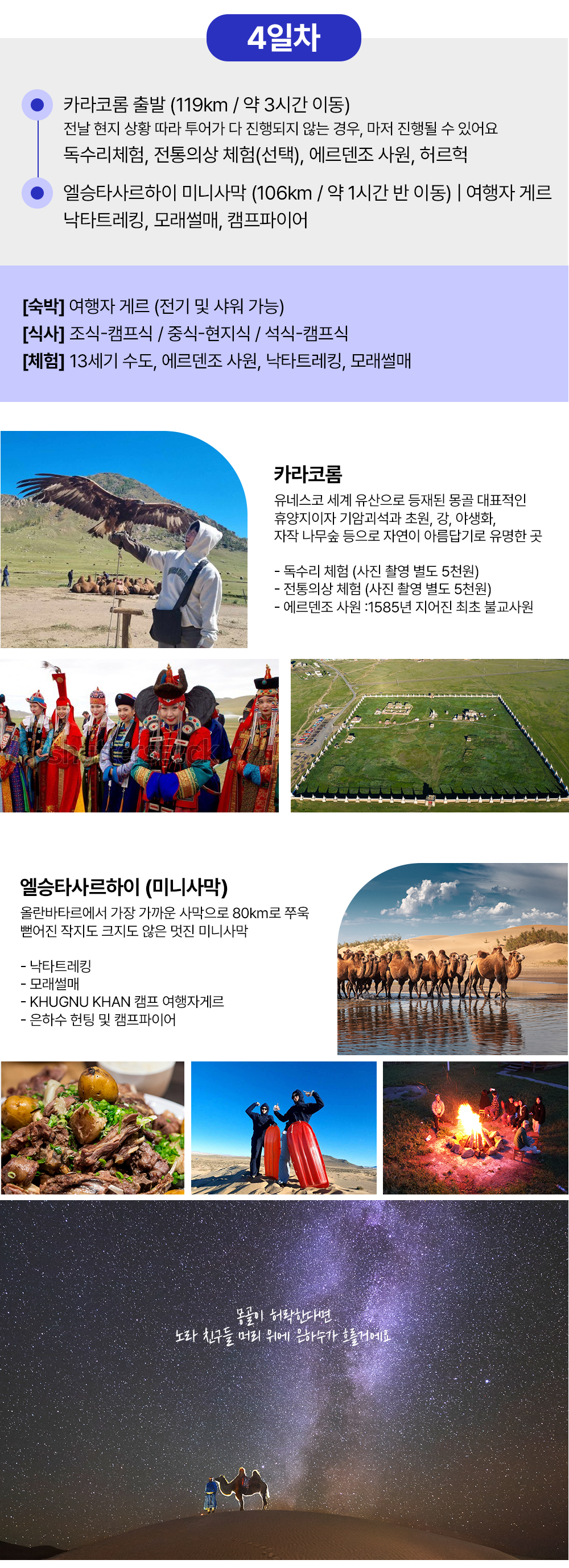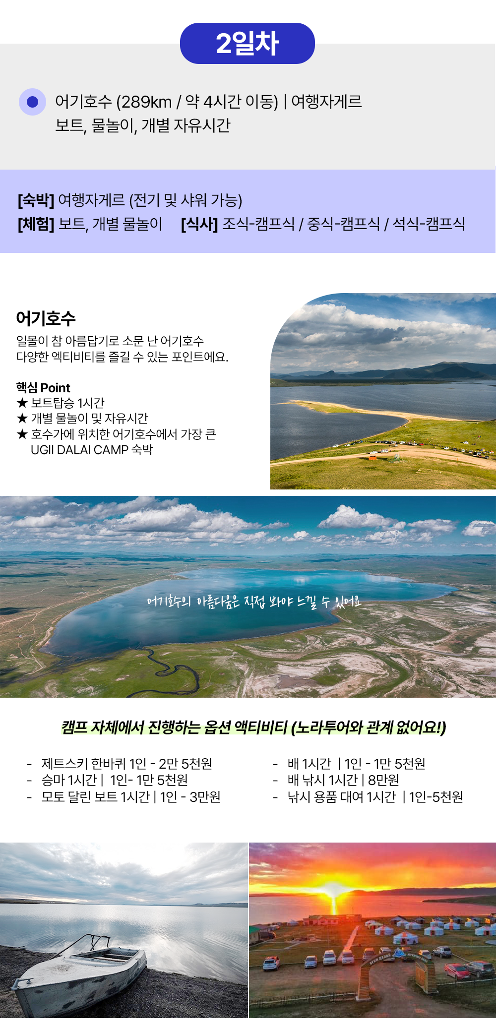 이 투어에서는 몽골의 대자연과 겨울 감성을 그대로 느낄 수 있는 어기호수, 칭헤르 온천, 카라코롬, 미니사막, 테를지 국립공원을 여행해요. 특히, 겨울철 고요하게 얼어붙은 어기호수에서는 보트 체험과 개별 물놀이, 초원 속에서 즐기는 야외 온천, 유네스코 세계유산 카라코롬 독수리 체험, 그리고 울란바토르에서 가장 가까운 사막 엘승타사르하이에서의 낙타 트래킹과 모래썰매까지 다채로운 겨울 액티비티가 준비되어 있어요.