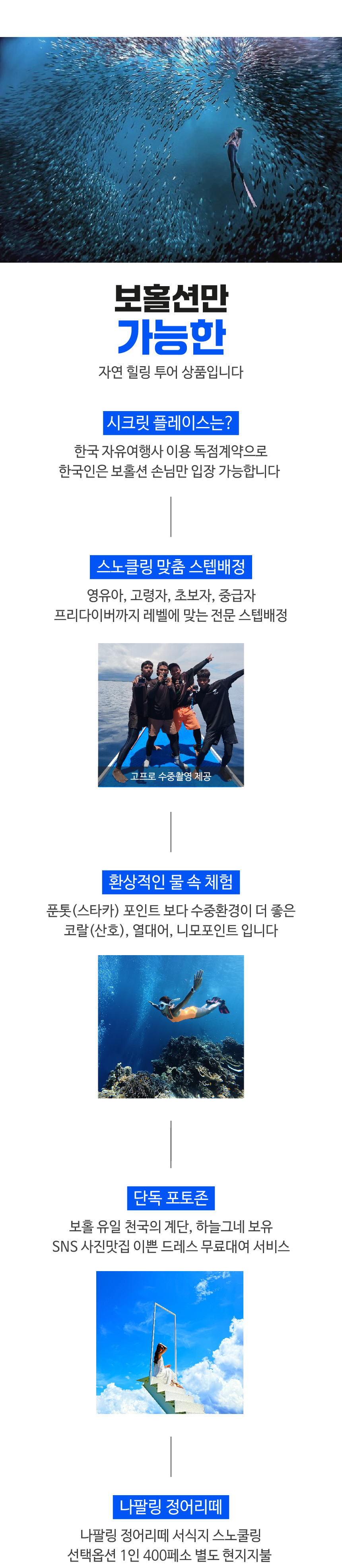 베스트최고예요!!! 포토존도 많고 진짜 말그대로 프라이빗해요~ 소수한정으로 몇팀만 하다보니 여유롭게 즐길수 있었어요 보홀에서 백숙을 먹을줄이야 백숙안에 찹쌀도 들어있고ㅎㅎ 제대로된 보양식 먹었어요 거기다가 김치맛집!!! 삼겹살도 맛있어요 망고도 파인애플도 수박도 맛있어요 거기다가 과자랑 음료 맥주도 그냥 막 퍼줘요ㅋㅋ 2인에 가이드 한명씩 붙여주시는데 진짜 편하게 포인트까지 튜브에 매달려 있으면 끌고가주세요 진짜진짜 편하게 했어요 장비도 깨끗함!!! 오리발도 빌려줌 대신 롱핀아니고 중핀정도 나팔링도 추가했는데 나팔링 꼭가세요!! 정어리떼 완전 장관이예요 가이드분들이 사진도 마니 찍어주심^^