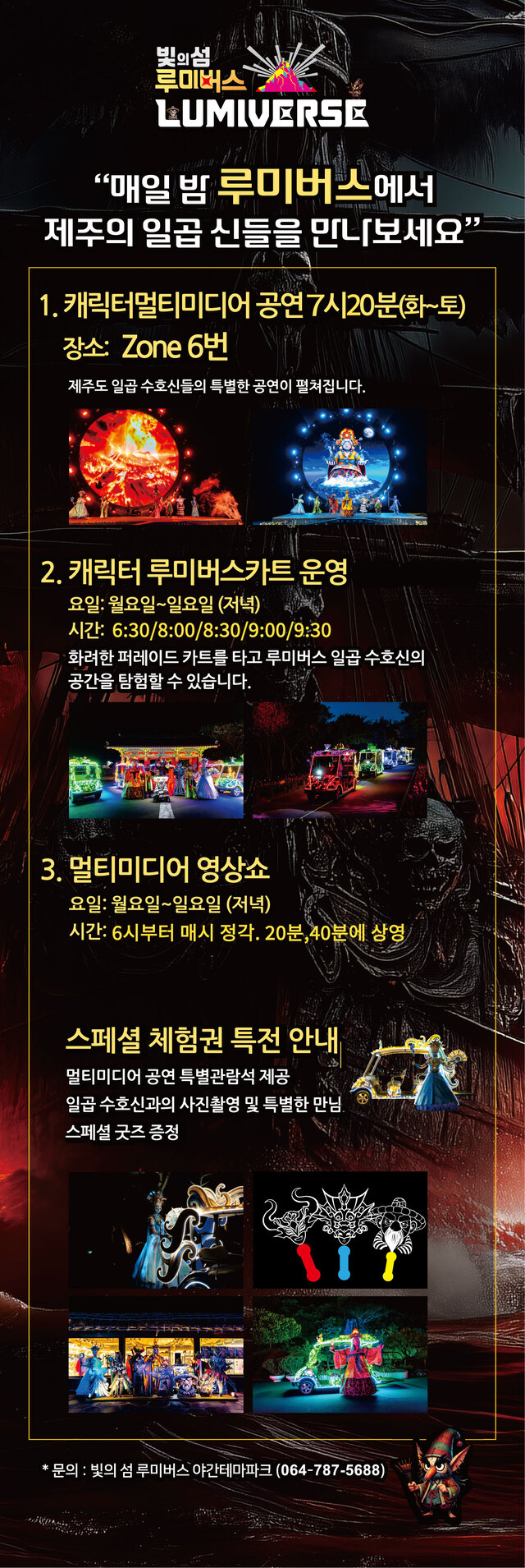 * 루미버스 일곱 수호자 캐릭터와 제주 탄생 신화를 표현한 멀티미디어 영상 매 20분 간격 상영