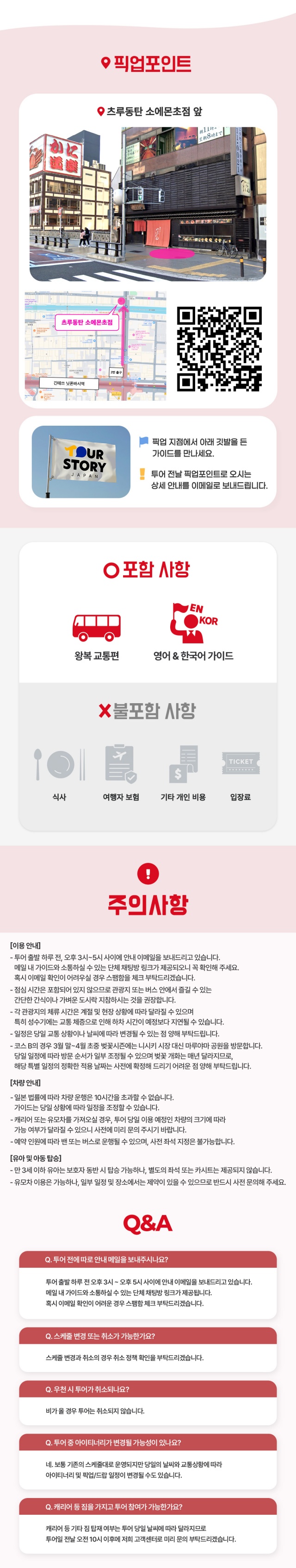 한국어 제공,영어 제공🌸B 코스는 벚꽃 시즌(통상적으로 3월 말 ~ 4월 초)에 한하여 니시키 시장 대신 마루야마 공원을 방문하는 것으로 일정을 조정할 예정입니다. 이에 따라 코스 내 각 방문지의 체류 시간 및 순서가 변경될 수 있음을 알려드립니다. 📍변경 시기: 벚꽃의 실제 개화 시기에 맞춰 일정이 변경됩니다. 📍일정 확정: 벚꽃 개화 시기는 매년 유동적이므로, 변경되는 정확한 날짜는 사전에 확정하기 어렵습니다. 벚꽃 개화 상황을 고려하여 추후 별도로 공지될 예정입니다. 상품 구매자 전원에게 오사카 나라 킨테츠 백화점 쿠폰을 드려요! 쿠폰은 구매내역 페이지에서 다운로드 가능합니다. 상품 구매자 전원에게 일본 빅카메라 7% 할인 쿠폰을 드려요! 쿠폰은 구매내역 페이지에서 다운로드 가능합니다. 상품 구매자 전원에게 일본 돈키호테 최대 15% 할인 쿠폰을 드려요! 쿠폰은 구매내역 페이지에서 다운로드 가능합니다.