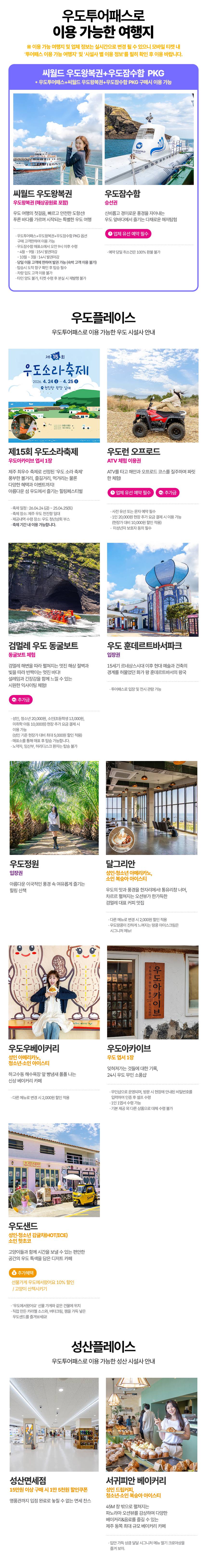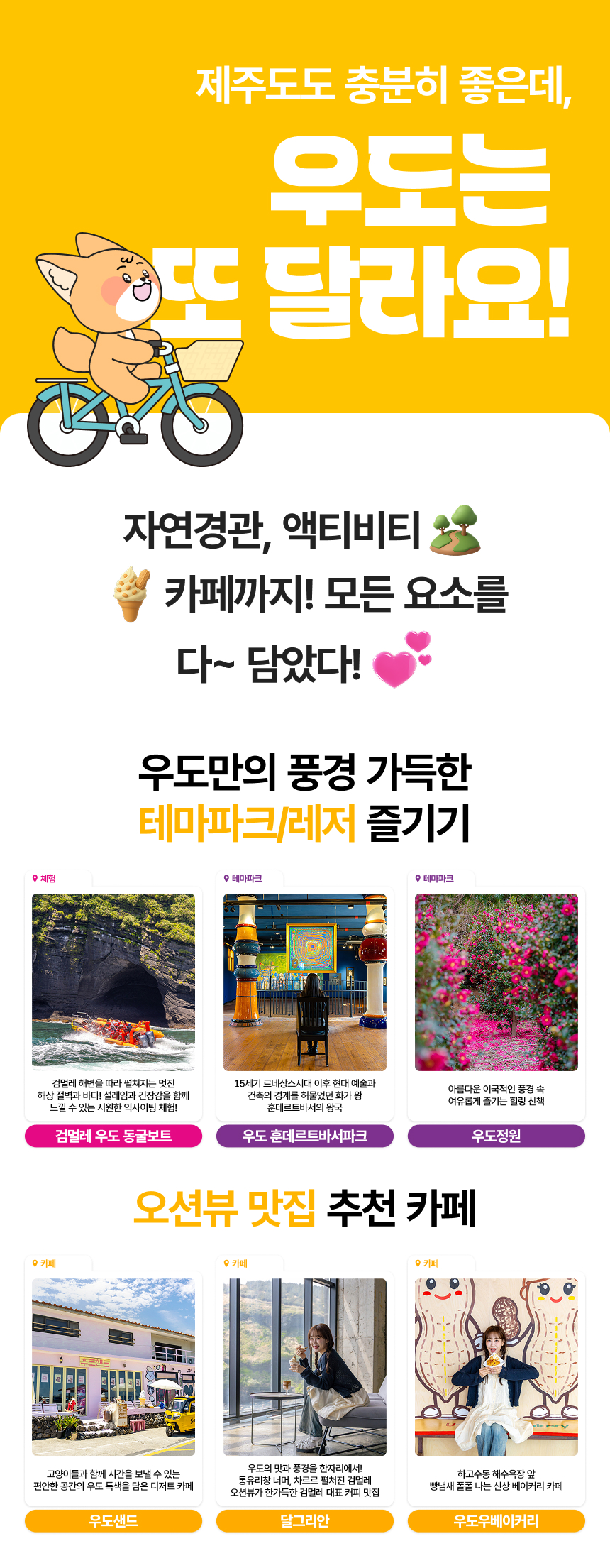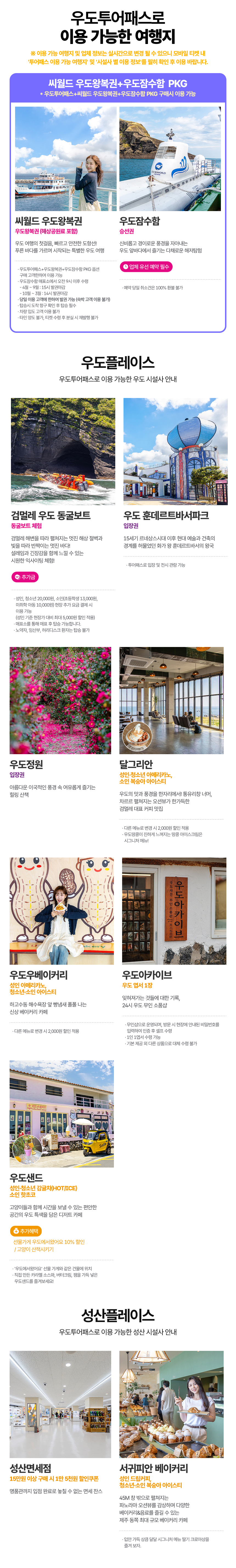 푸르른 바다가 있는 제주도, 우도에서 투어 패스와 함께 즐거운 시간을 보내보세요. 유명 카페와 식당부터 각종 체험까지! 게다가 우도 입도하는 왕복여객선도 함께 구매할 수 있어요. 우도투어패스와 함께 합리적인 가격으로 알찬 여행을 즐겨 보세요!