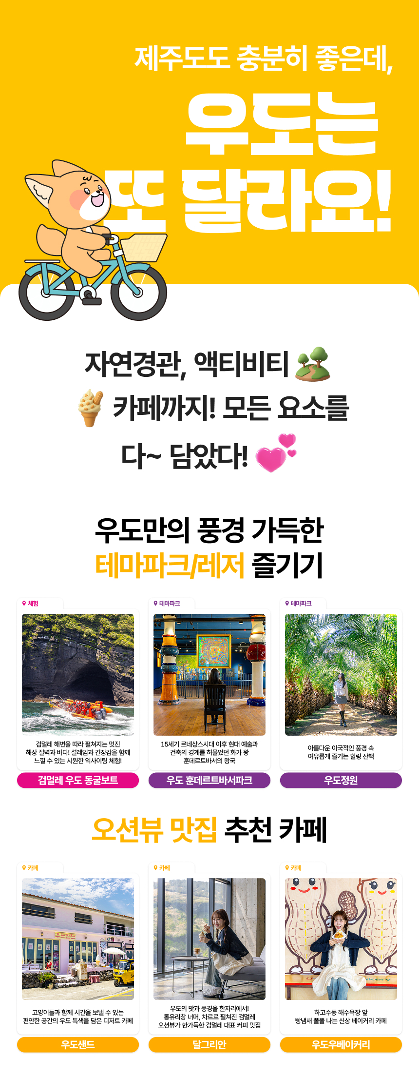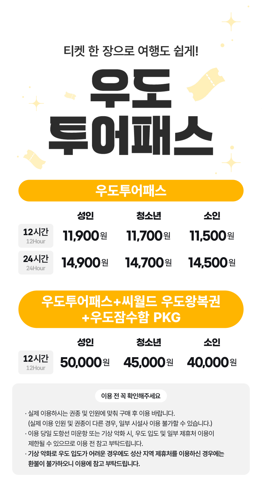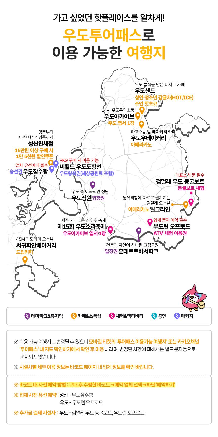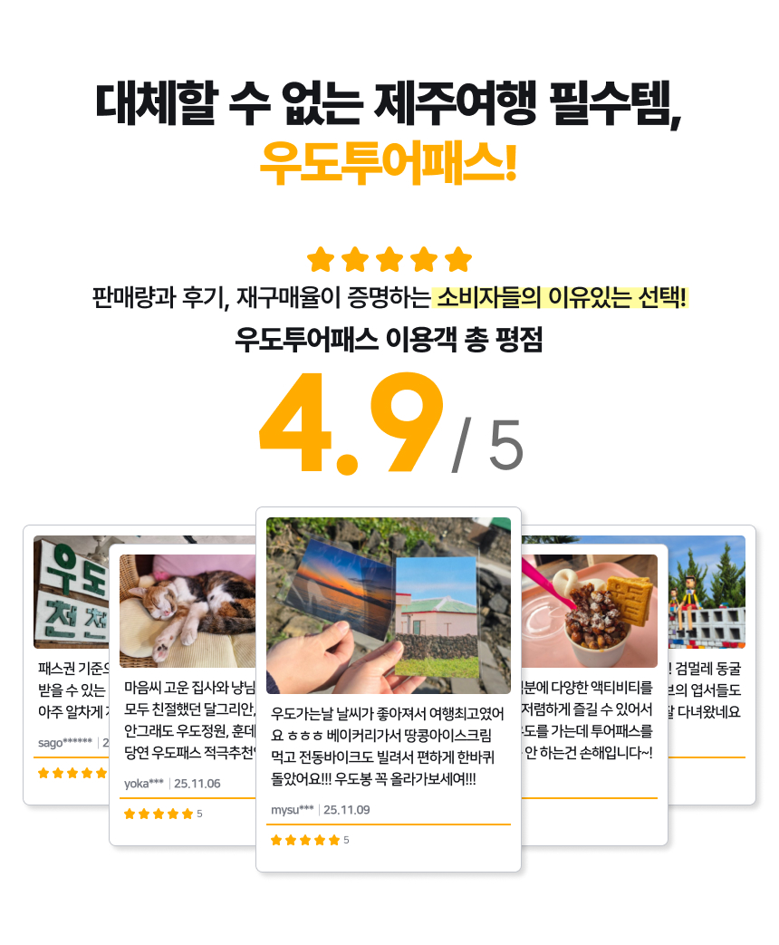 푸르른 바다가 있는 제주도, 우도에서 투어 패스와 함께 즐거운 시간을 보내보세요. 유명 카페와 식당부터 각종 체험까지! 게다가 우도 입도하는 왕복여객선도 함께 구매할 수 있어요. 우도투어패스와 함께 합리적인 가격으로 알찬 여행을 즐겨 보세요!