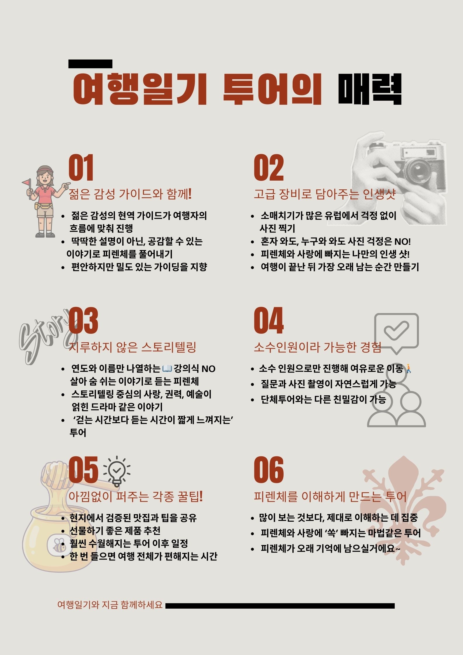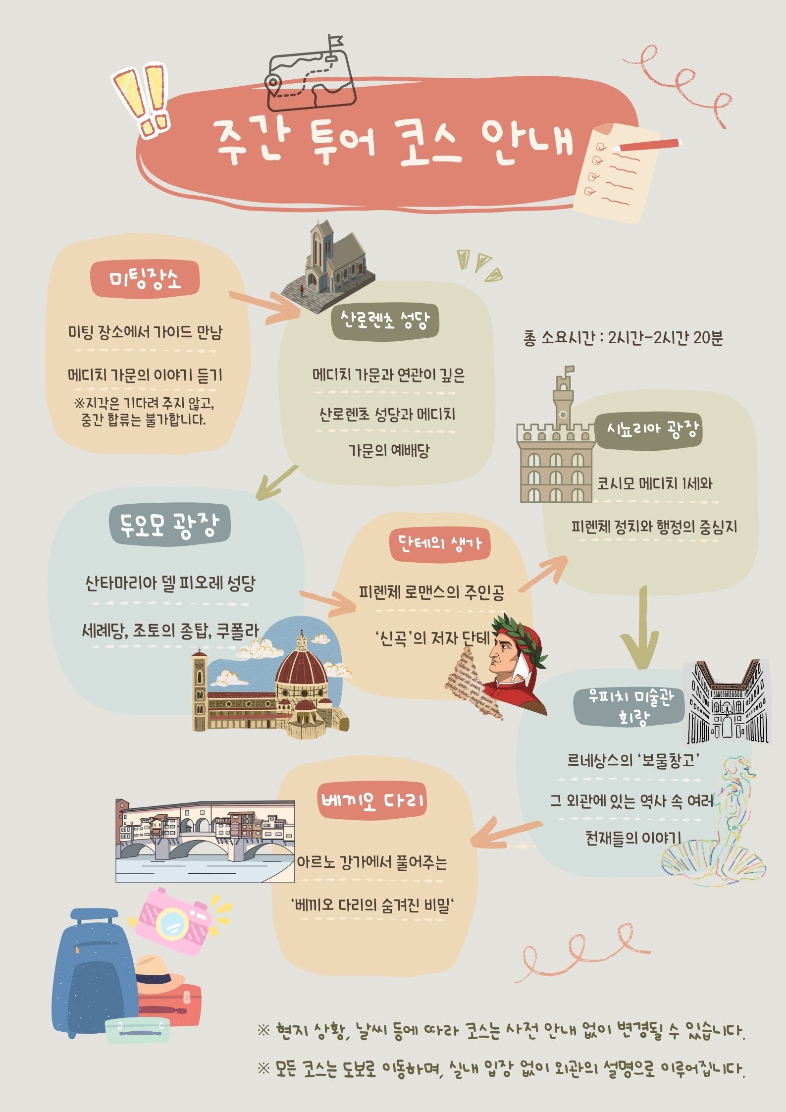 피렌체의 매력을 제대로 보여줄 도보 투어가 여기 있어요! 피렌체 베테랑 전문 가이드의 귀에 쏙쏙 박히는 스토리텔링과 함께 피렌체의 과거와 현재, 문화까지 다양한 이야기들을 들으며 즐거운 시간 보내 보세요. 르네상스의 아름다운 도시 피렌체를 쉽고 재미있게, 그리고 깊이 있게 안내해 드릴 거예요. 핵심만 콕콕 짚어내 효율적으로 짠 동선을 따라가며 르네상스의 상징인 성모마리아 대성당과 메디치 가문의 이야기를 두오모 대성당에서 만나 보세요. 또한 기베르티의 걸작 천국의 문에 담긴 인간 중심의 종교관에 대한 이야기를 들어 보세요. 딱딱한 수학여행 같은 투어는 이제 그만! 영화, 소설로 다양한 스토리를 통해 남녀노소 누구나 즐길 수 있는 유쾌하고 알찬 투어를 경험해 보세요.