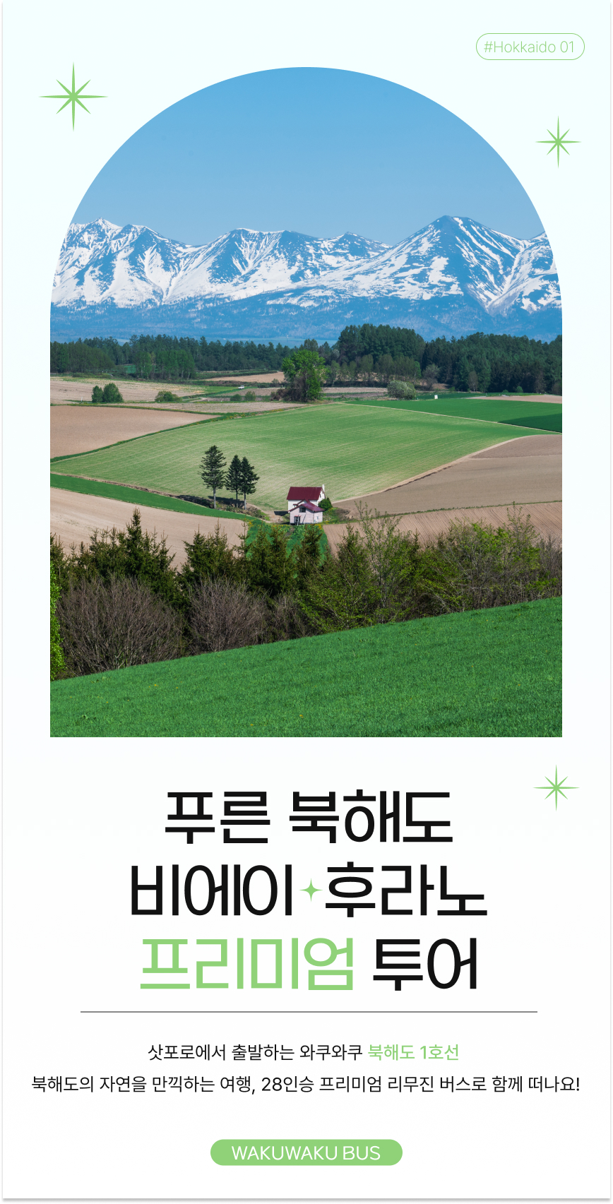 와쿠와쿠 프리미엄 리무진 버스로 떠나는 북해도 1호선 투어를 소개드립니다. 편안하고 여유로운 여행을 위해 특별히 준비한 29인승 리무진 버스에서 매력 넘치는 한국인 가이드와 함께 북해도의 사계절을 만끽해보세요! 가슴이 뻥 뚫리는 푸른 자연경관과 미술관 같은 풍경을 동시에 즐길 수 있는 곳, 북해도 여행을 떠나고 싶다면 해당 투어를 추천해 드려요.