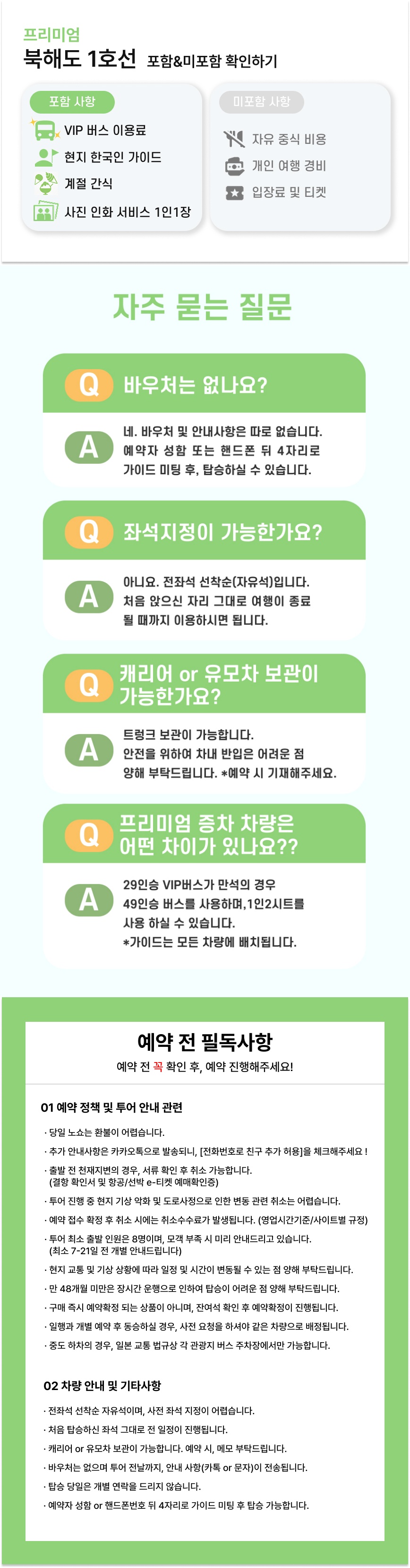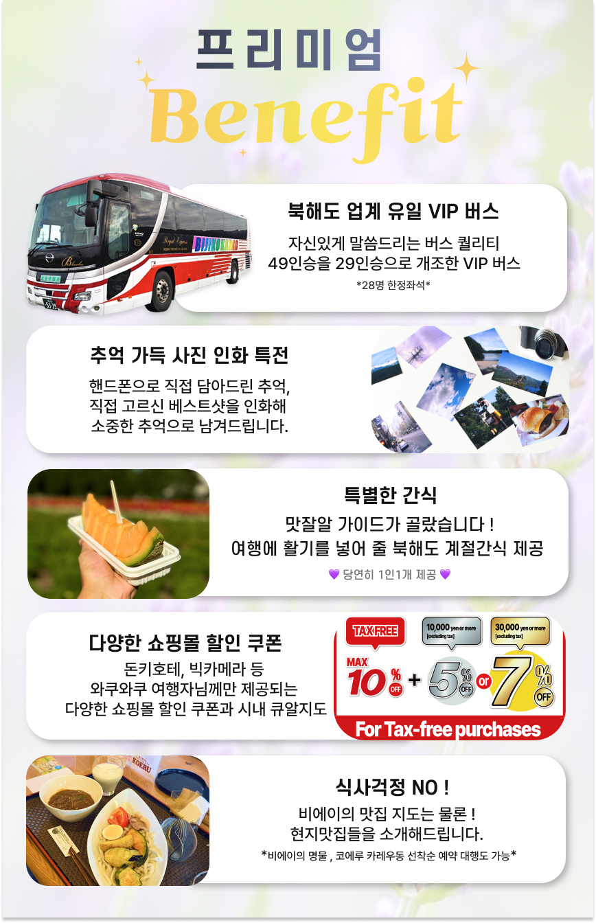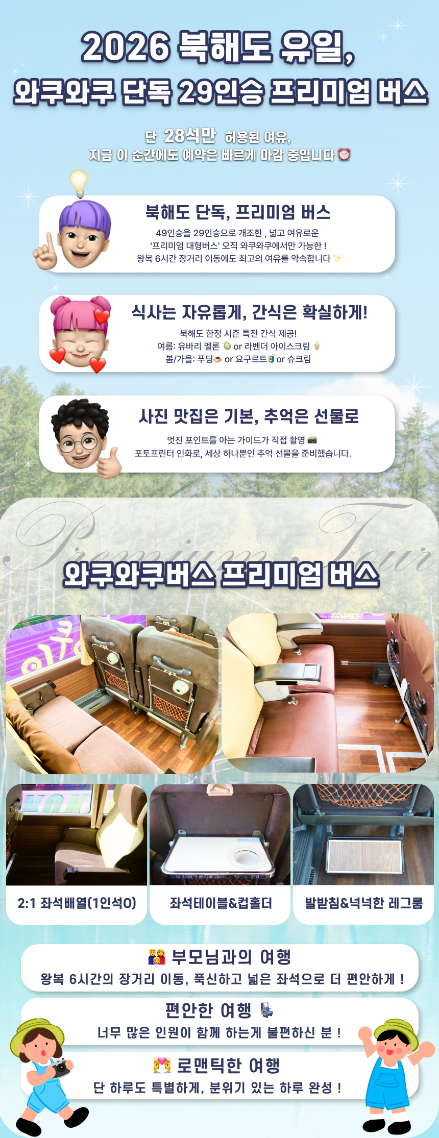 한국어 제공🚌 크기는 그대로, 좌석은 넓게! 28인승 버스로 편안한 투어를 즐겨보세요 🚌 ❤️ 와쿠와쿠 프리미엄 투어에서만 드리는 혜택 ❤️ ✨ 북해도 업계 유일, VIP 리무진 대형 버스로 즐기는 투어 프리미엄 리무진 버스 | 2:1 배치로, 쾌적한 넓이의 29인승 대형 리무진 버스🤎 ✨ 추억 가득, 사진 인화 특전 제공 ✨ 맛잘알 가이드가 고른 북해도 계절 간식 1인 1개 제공 ✨ 특별 제작한 QR 맛집 지도 제공 및 돈키호테 할인 쿠폰 제공 상품 구매자 전원에게 일본 빅카메라 7% 할인 쿠폰을 드려요! 쿠폰은 구매내역 페이지에서 다운로드 가능합니다. 상품 구매자 전원에게 일본 사츠도라 5% 할인 쿠폰을 드려요! 쿠폰은 구매내역 페이지에서 다운로드 가능합니다. 상품 구매자 전원에게 일본 돈키호테 최대 15% 할인 쿠폰을 드려요! 쿠폰은 구매내역 페이지에서 다운로드 가능합니다.