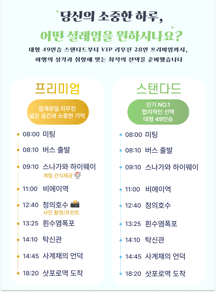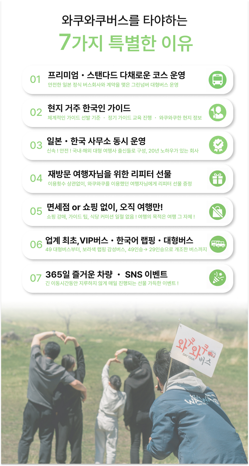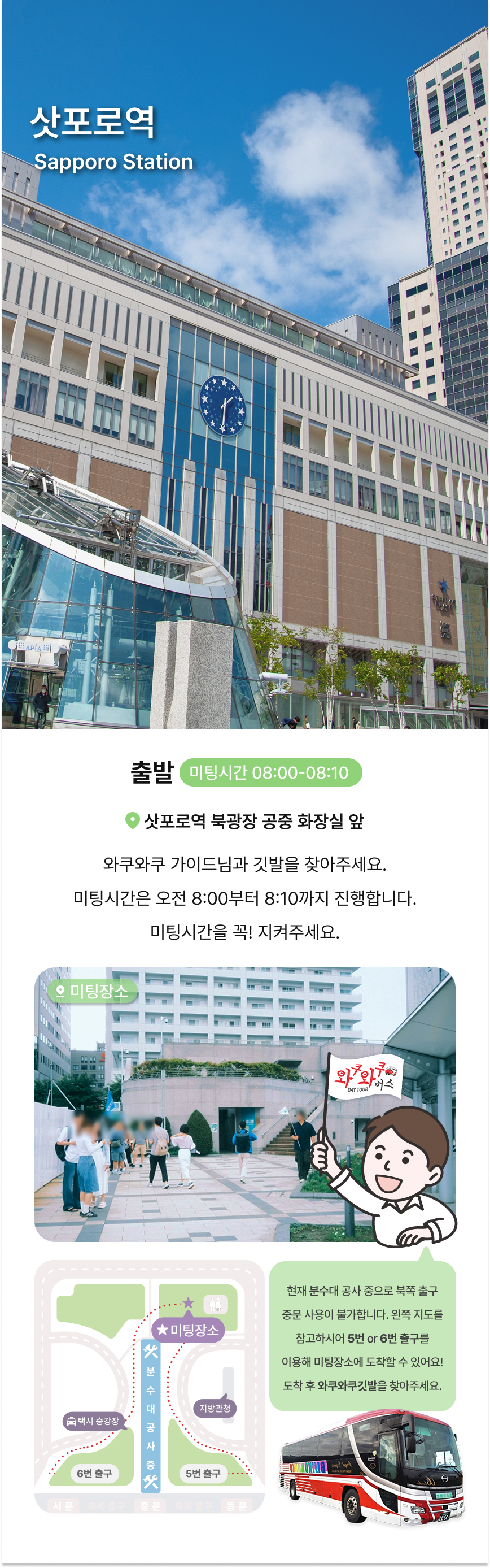 한국어 제공🚌 크기는 그대로, 좌석은 넓게! 28인승 버스로 편안한 투어를 즐겨보세요 🚌 ❤️ 와쿠와쿠 프리미엄 투어에서만 드리는 혜택 ❤️ ✨ 북해도 업계 유일, VIP 리무진 대형 버스로 즐기는 투어 프리미엄 리무진 버스 | 2:1 배치로, 쾌적한 넓이의 29인승 대형 리무진 버스🤎 ✨ 추억 가득, 사진 인화 특전 제공 ✨ 맛잘알 가이드가 고른 북해도 계절 간식 1인 1개 제공 ✨ 특별 제작한 QR 맛집 지도 제공 및 돈키호테 할인 쿠폰 제공 상품 구매자 전원에게 일본 빅카메라 7% 할인 쿠폰을 드려요! 쿠폰은 구매내역 페이지에서 다운로드 가능합니다. 상품 구매자 전원에게 일본 사츠도라 5% 할인 쿠폰을 드려요! 쿠폰은 구매내역 페이지에서 다운로드 가능합니다. 상품 구매자 전원에게 일본 돈키호테 최대 15% 할인 쿠폰을 드려요! 쿠폰은 구매내역 페이지에서 다운로드 가능합니다.