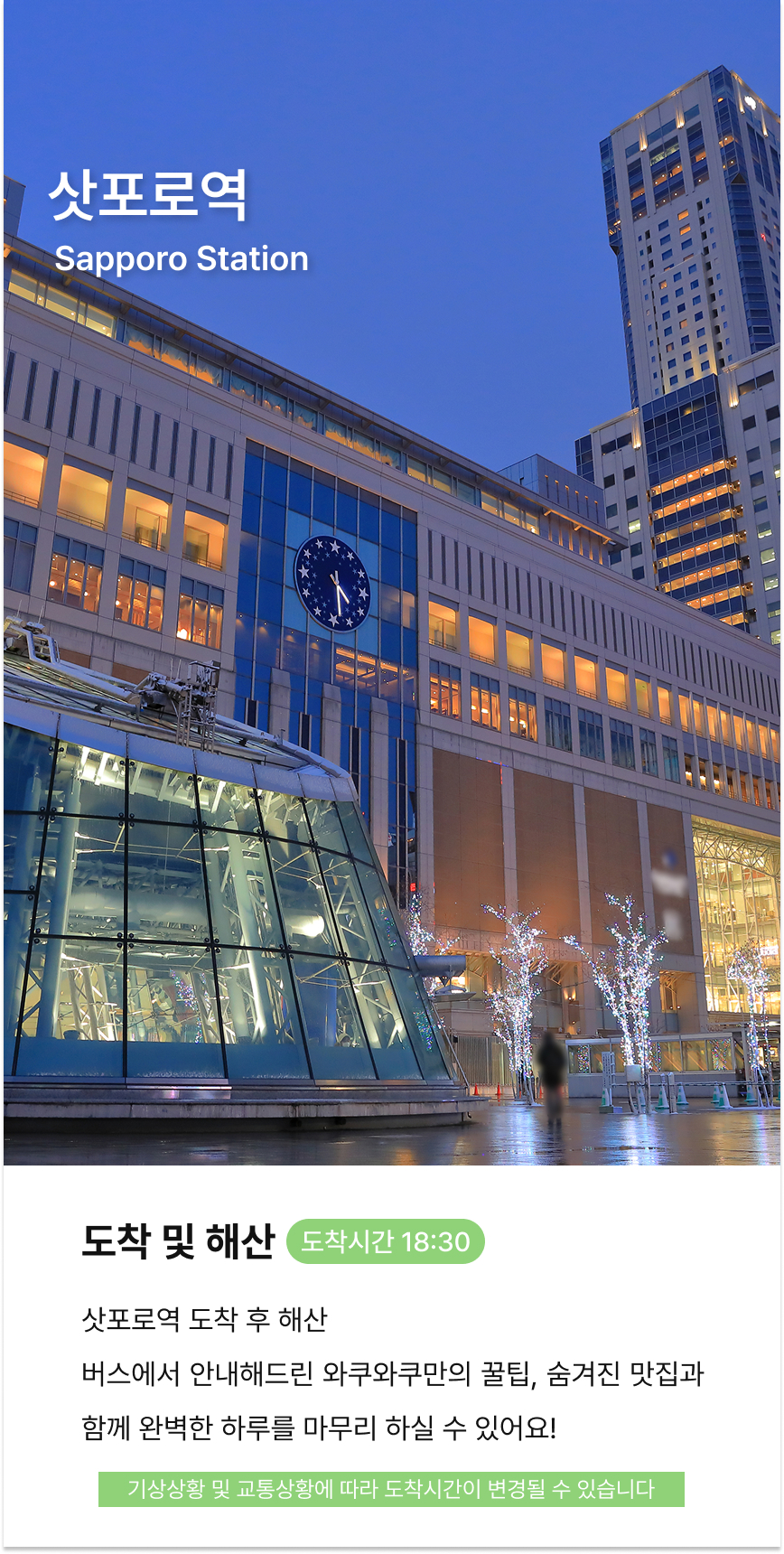 베스트비가 와서 걱정이 많이 되었는데 청의 호수도 탁신관도 너무 운치 있고 좋았습니다. 장소마다 자세히 알려주시고 삿포로 여행의 세심한 꿀팁까지 친절히 알려주셔서 좋더라구요. 투어를 일찍할 걸 그랬나봐요. 내일 가는데...ㅠㅠ 용기 가이드님! 도착하는 곳마다 사진 예쁘게 찍어주시고 인화까지 정성스럽게 해주셔서 감사했습니다. 마지막으로 알려주신 가이드 맛집 정보도 너무 좋았습니다. 덕분에 저녁도 진짜 맛있게 잘먹었어요. ^^ 버스 좌석도 너무 편하고 왕 추천합니다.
