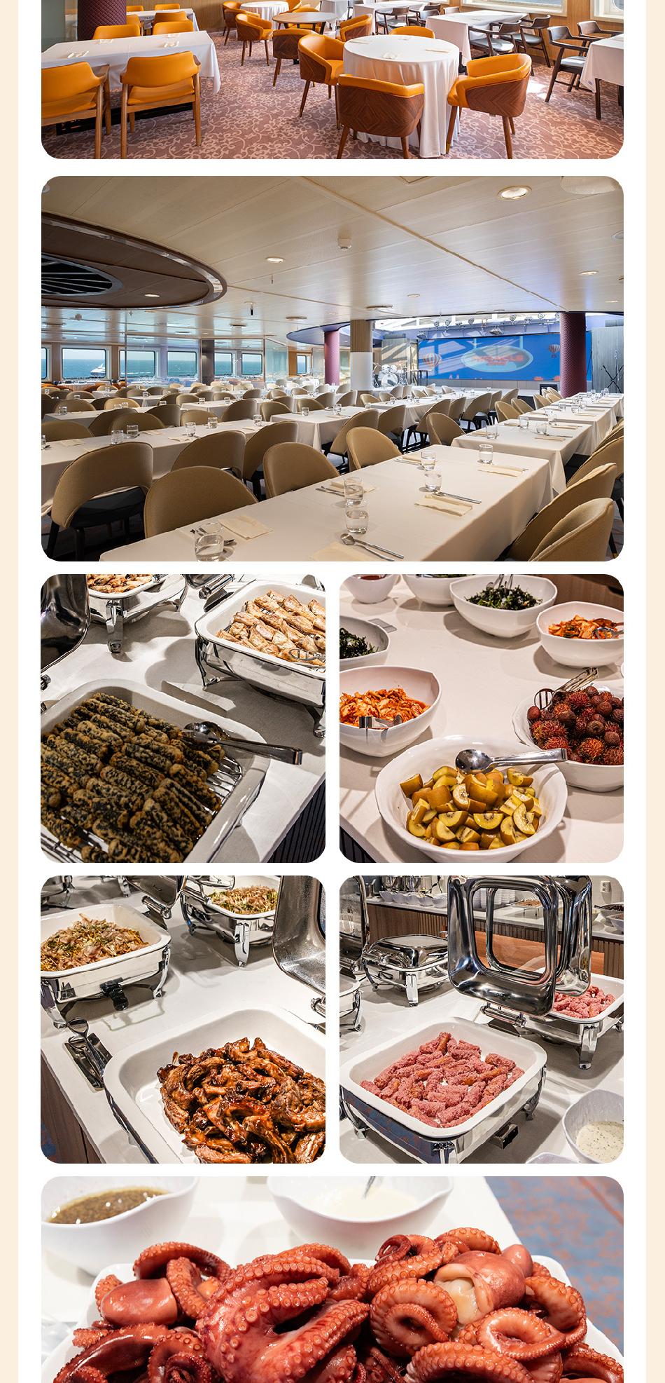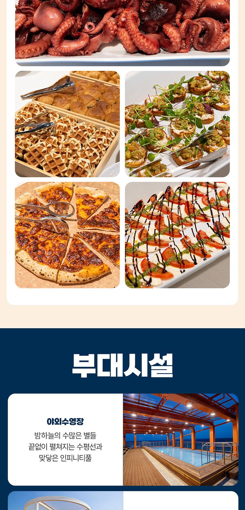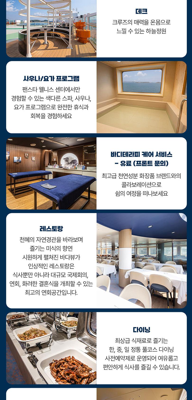 5성급 호텔을 연상시키는 세련된 인테리어와 편안하면서도 품격 있는 공간, 그 안에서 펼쳐지는 호화 크루즈 여행의 진수예요. 팬스타 미라클 크루즈에서는 심심할 틈이 없는 다양한 즐길거리와 화려한 공연이 매일 이어지고, 일상의 스트레스를 날려주는 아름답고 환상적인 바다 풍경이 함께해요. 크루즈 내 면세점에서는 여행의 추억을 더욱 풍성하게 채워줄 특별한 아이템들을 만나볼 수 있고, 가족·연인과 함께라면 밤하늘의 수많은 별 아래 인피니티풀과 야외포차에서 낭만적인 시간을 즐길 수 있어요. 하늘정원과 데크에서 바다를 온몸으로 느끼며, 웰니스센터에서 몸과 마음을 재충전해보세요. 또한 국내 최저가 위스키를 비롯한 다채로운 쇼핑, 프라이빗한 VIP 라운지와 레스토랑, 천혜의 자연경관을 바라보며 즐기는 식사, 품격과 격식을 갖춘 세미나룸까지! 이 모든 것이 팬스타 미라클 크루즈 안에 담겨 있어요.