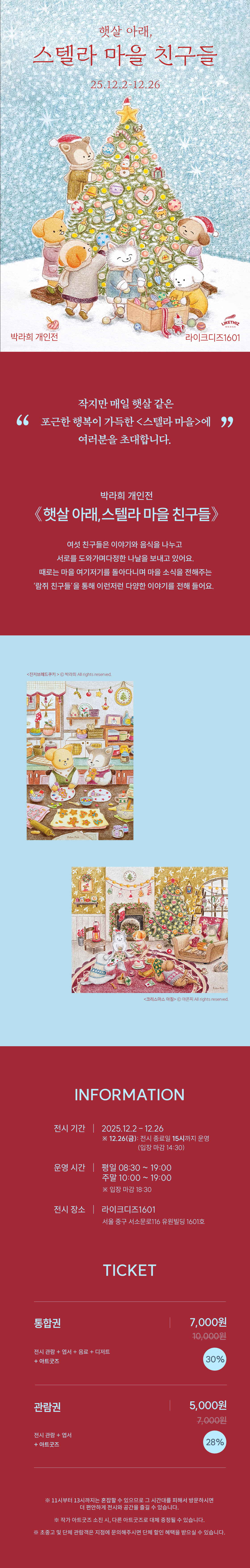 빵을 굽는 보리, 뜨개질하는 코코, 차를 사랑하는 모카, 이야기꾼 크림, 책을 좋아하는 율무, 꽃을 아끼는 루루, 그리고 바닷가 고양이 솔트까지 이 친구들이 살아가는 작은 마을 속으로 관람객을 초대합니다. 이 전시의 가장 큰 매력은 스토리북처럼 이어지는 감성 세계관으로, 서로 하루를 나누고 편지를 주고받는 다정한 이야기 속에서 관람객도 자연스럽게 “어른의 동심”을 회복하게 됩니다. 조용하고 따뜻한 숲속 감성과 작은 행복이 차곡차곡 쌓인 이 전시는, 바쁜 일상 속에서 잠시 숨을 고르며 마음이 쉬어갈 수 있는 시간을 선물해줄 거예요. 🌿✨