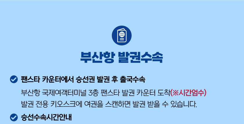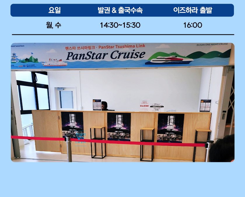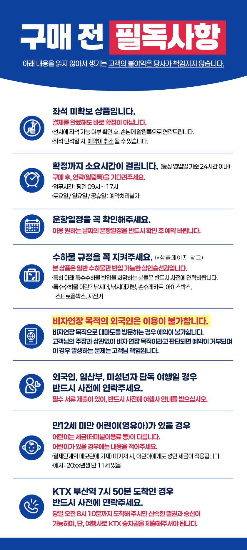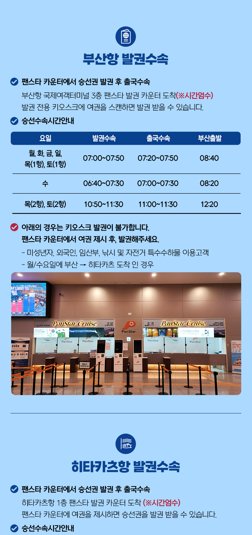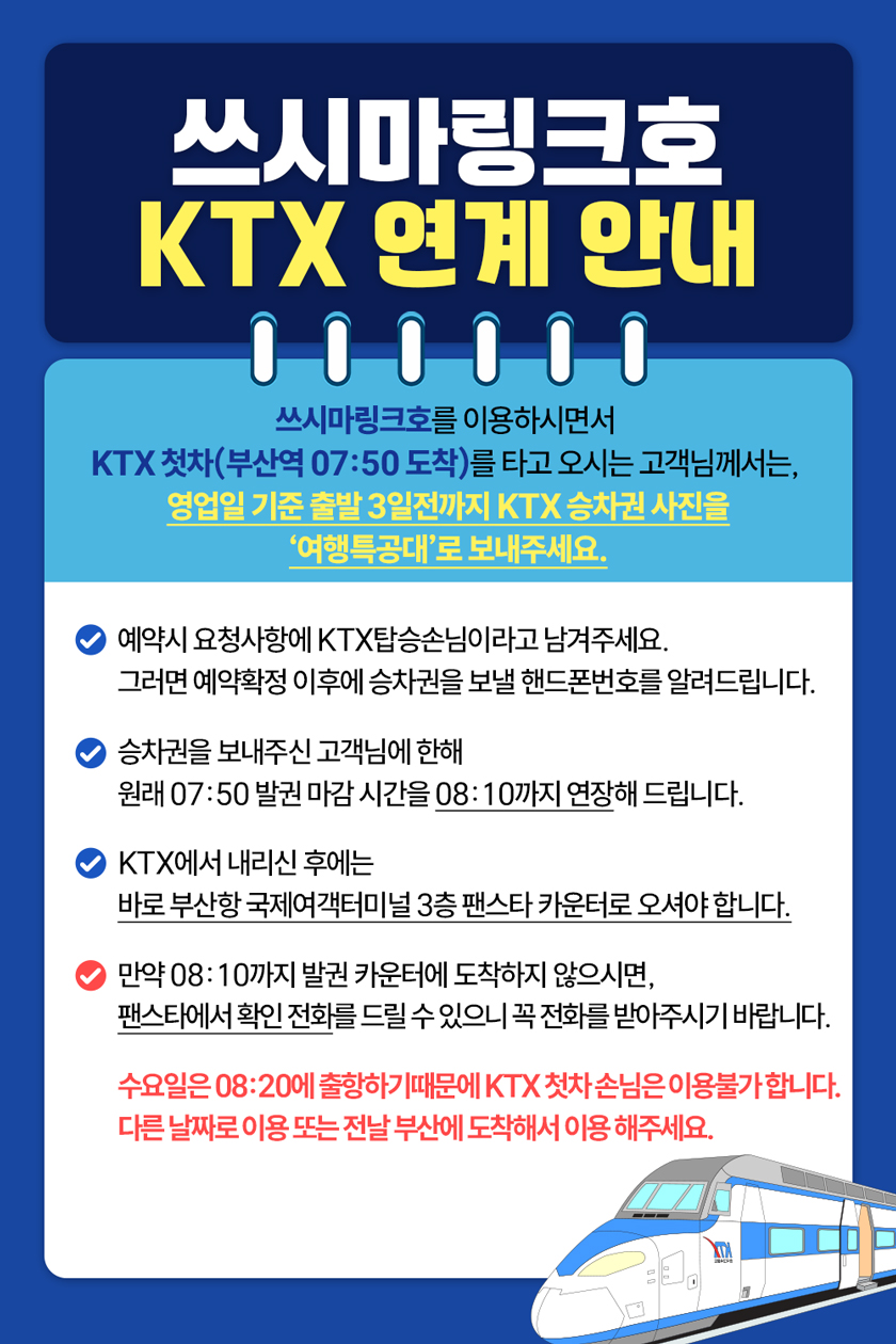 * 부산역에서 부산항국제여객터미널까지 도보 15-20분 소요되므로 반드시 부산역 도착시간을 확인하시어, 수속에 지장이 없도록 하시기 바랍니다.