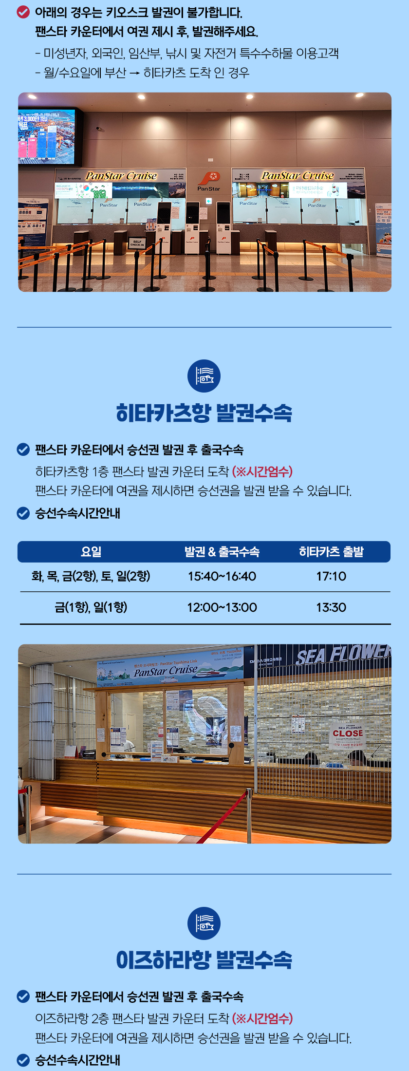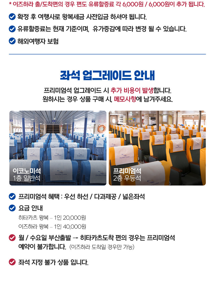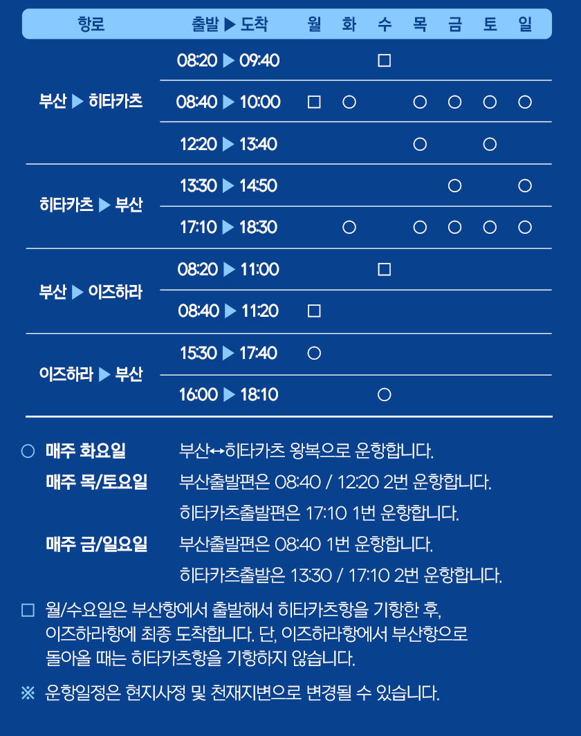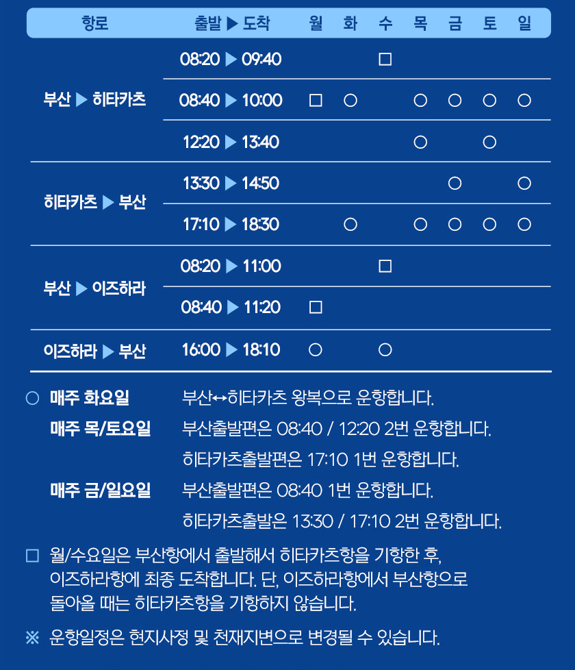 * 월/수요일은 부산항에서 출발해서 히타카츠항을 기항한 후, 이즈하라항에 최종 도착합니다. 단, 이즈하라항에서 부산항으로 돌아올 때는 히타카츠항을 기항하지 않습니다.