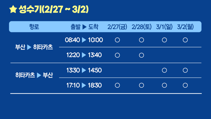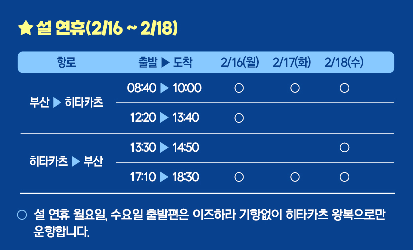 * 설 연휴 월요일, 수요일 출발편은 이즈하라 기항없이 히타카츠 왕복으로만 운항합니다.