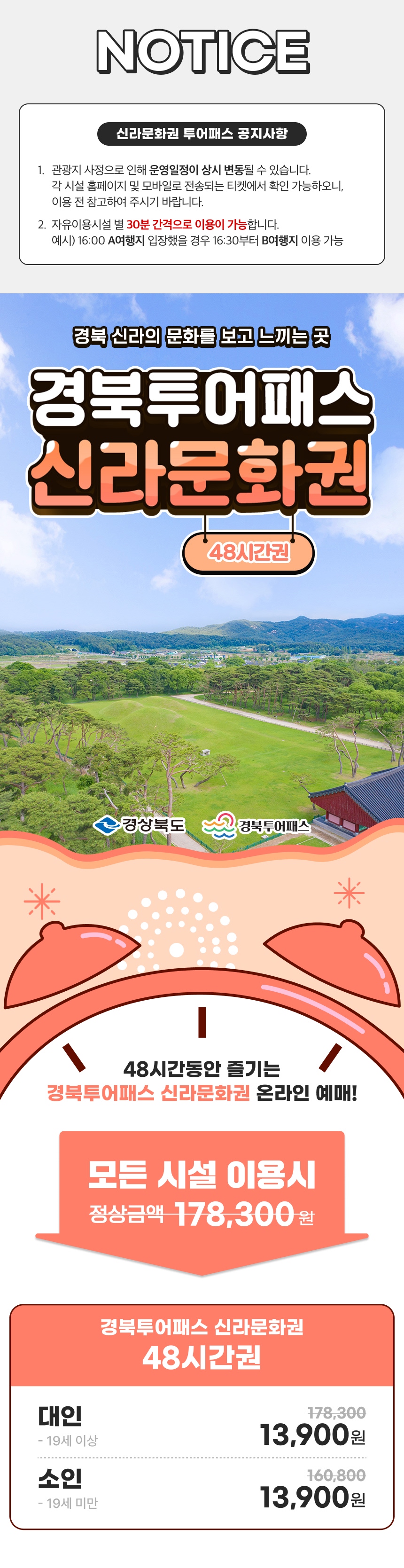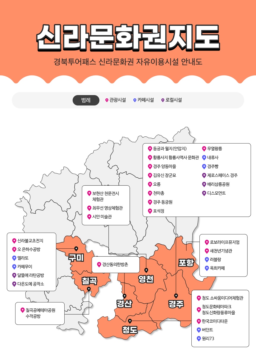 하나의 패스만 있으면 신라문화권의 핵심 관광지들을 48시간 동안 자유롭게 입장할 수 있어, 시간과 비용을 절약하며 알찬 여행을 계획할 수 있어요. 유네스코 세계유산으로 지정된 불국사, 석굴암부터 신라 왕릉의 신비로움, 그리고 황리단길의 현대적인 감성까지! 역사 애호가들은 물론, 아이들에게는 살아있는 역사 교육의 장이 될 거예요. 경북투어패스 '신라문화권'과 함께 시간 여행을 떠나, 신비롭고 아름다운 신라의 매력에 푹 빠져보세요!
