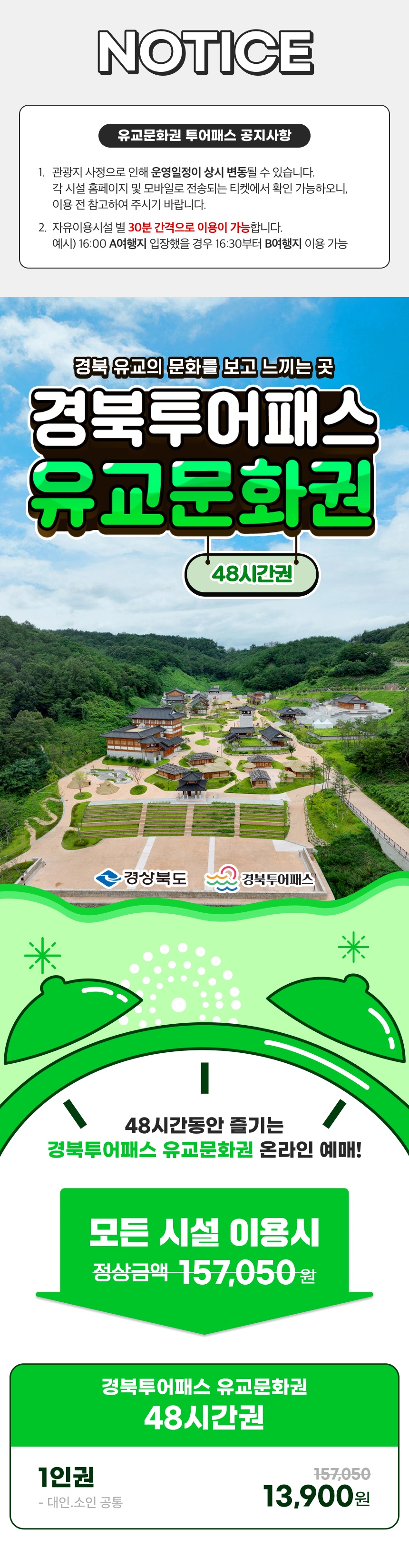 하나의 패스만 있으면 유교문화권의 주요 명소들을 자유롭게 방문할 수 있어, 번거로움 없이 알찬 여행을 계획할 수 있어요. 유네스코 세계유산으로 등재된 하회마을, 도산서원 등 유구한 역사와 아름다운 자연이 어우러진 고택과 서원들을 둘러보세요. 고요한 분위기 속에서 전통 문화를 체험하고, 자연 속에서 사색에 잠기는 시간을 가질 수 있어요. 경북투어패스 '유교문화권'과 함께 한국 정신문화의 깊이를 탐험하며 잊지 못할 평화로운 추억을 만들어 보세요!