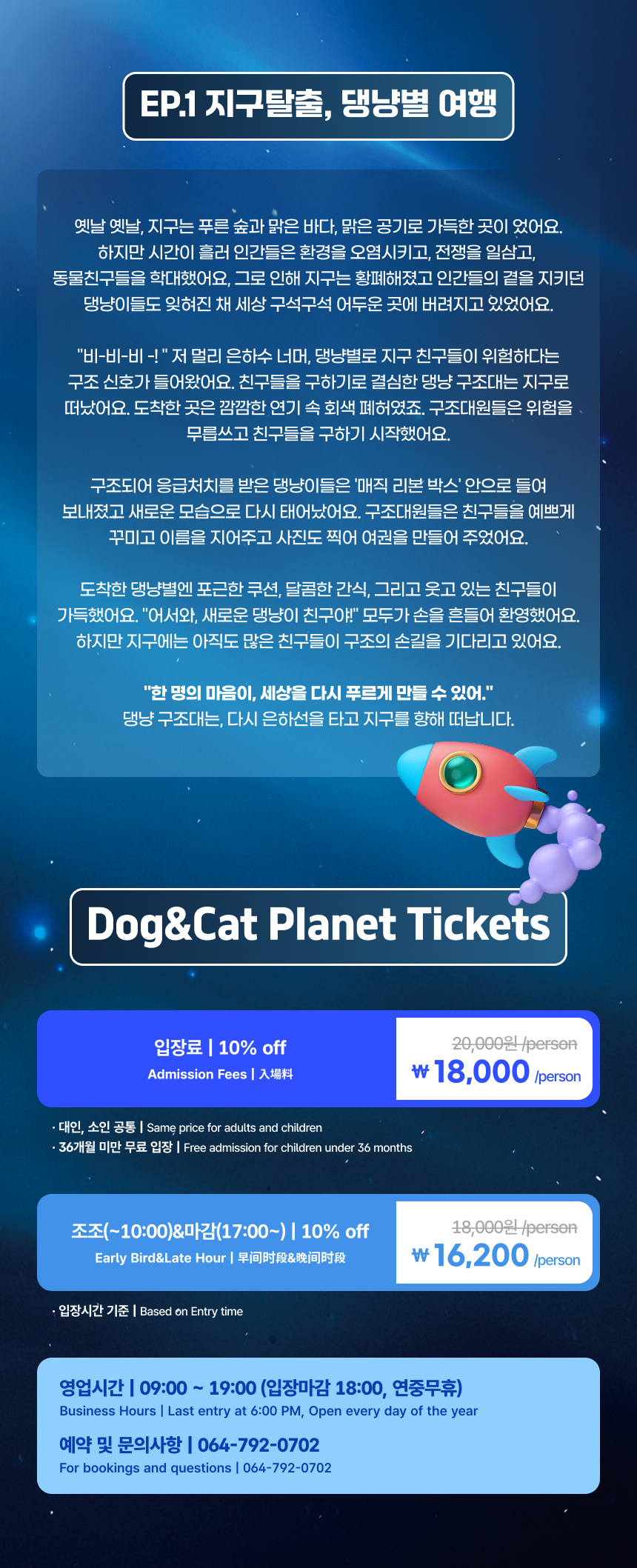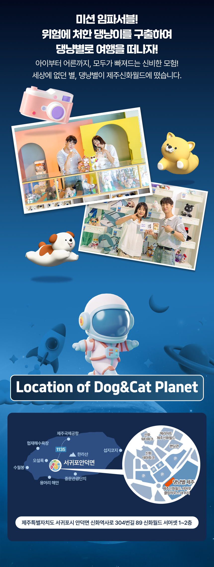 제주의 푸른 하늘 아래, 세상 어디에도 없던 특별한 모험이 펼쳐집니다! 서귀포 '댕냥별(Dog&Cat Planet)'은 푸르던 모습을 잃고 황폐해진 지구를 구하기 위해 용감한 댕냥 구조대가 되어 미션을 수행하는 감성 미션 어드벤처 공간이에요. 사랑스러운 댕냥이 친구들과 함께 잊지 못할 추억을 만들어 보세요!