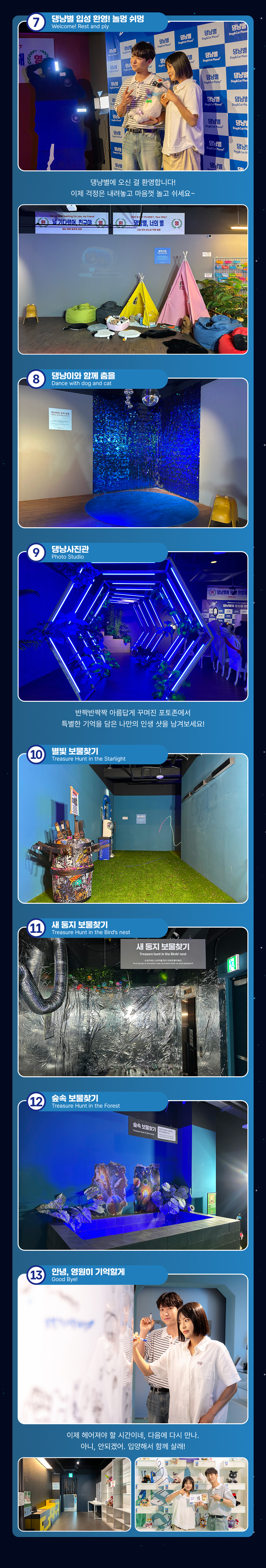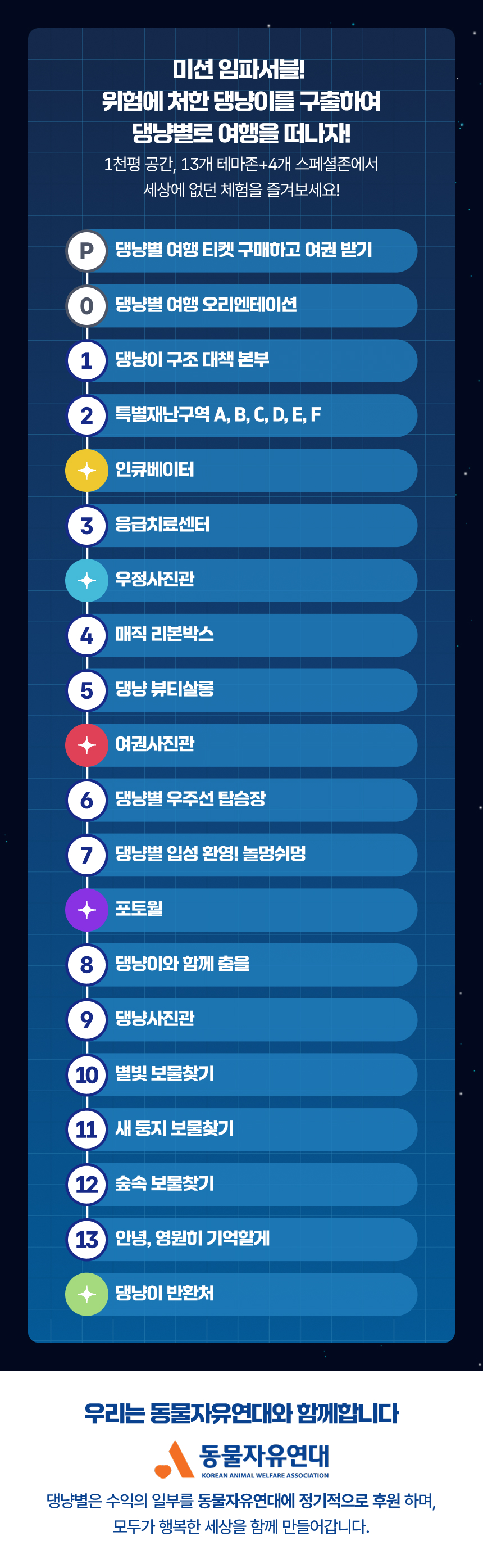 '에피소드 01. 지구 구출 대모험 여행'이라는 스토리 속에서 20가지가 넘는 미션과 다양한 어드벤처 코스를 경험할 수 있어요. 거대한 댕냥이 친구들을 만나는 A존부터, 손발을 이용하는 레이저 미로, 균형 감각을 시험하는 밸런스 미션, 스릴 넘치는 클라이밍까지! 지구별과 댕냥별을 넘나들며 다채로운 미션들을 해결해 나가는 재미가 가득해요. 아이들은 물론, 온 가족과 친구, 연인 모두가 함께 협동하며 미션을 클리어하고, 포근한 쿠션과 달콤한 간식이 기다리는 '댕냥별'로 돌아가는 꿈같은 여정을 떠나보세요!