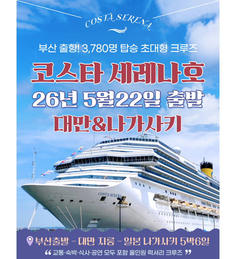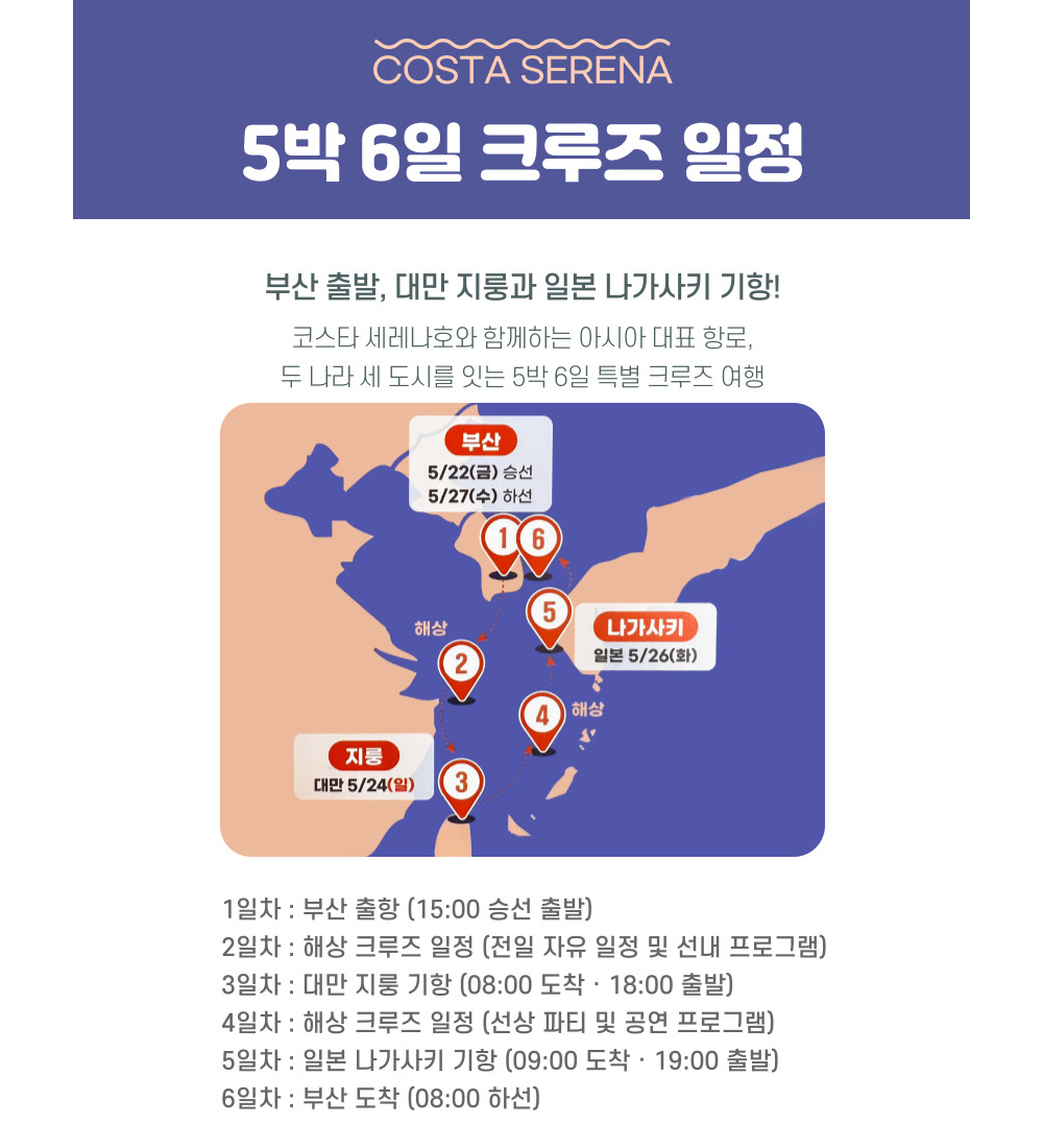 🚢부산에서 출발해 대만 기륭과 일본 나가사키를 잇는 두 나라 세 도시의 특별한 항해가 시작됩니다. 아시아 대표 항로를 따라 이어지는 여정에서, 코스타 세레나호가 선사하는 럭셔리하고 여유로운 5박 6일의 바다 여행을 만나보세요. 🌏✨