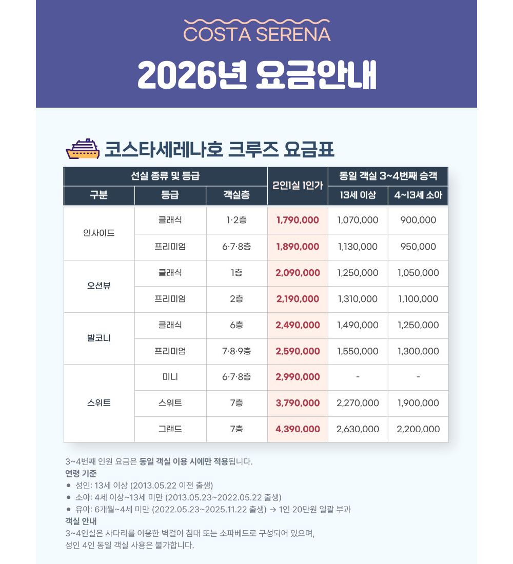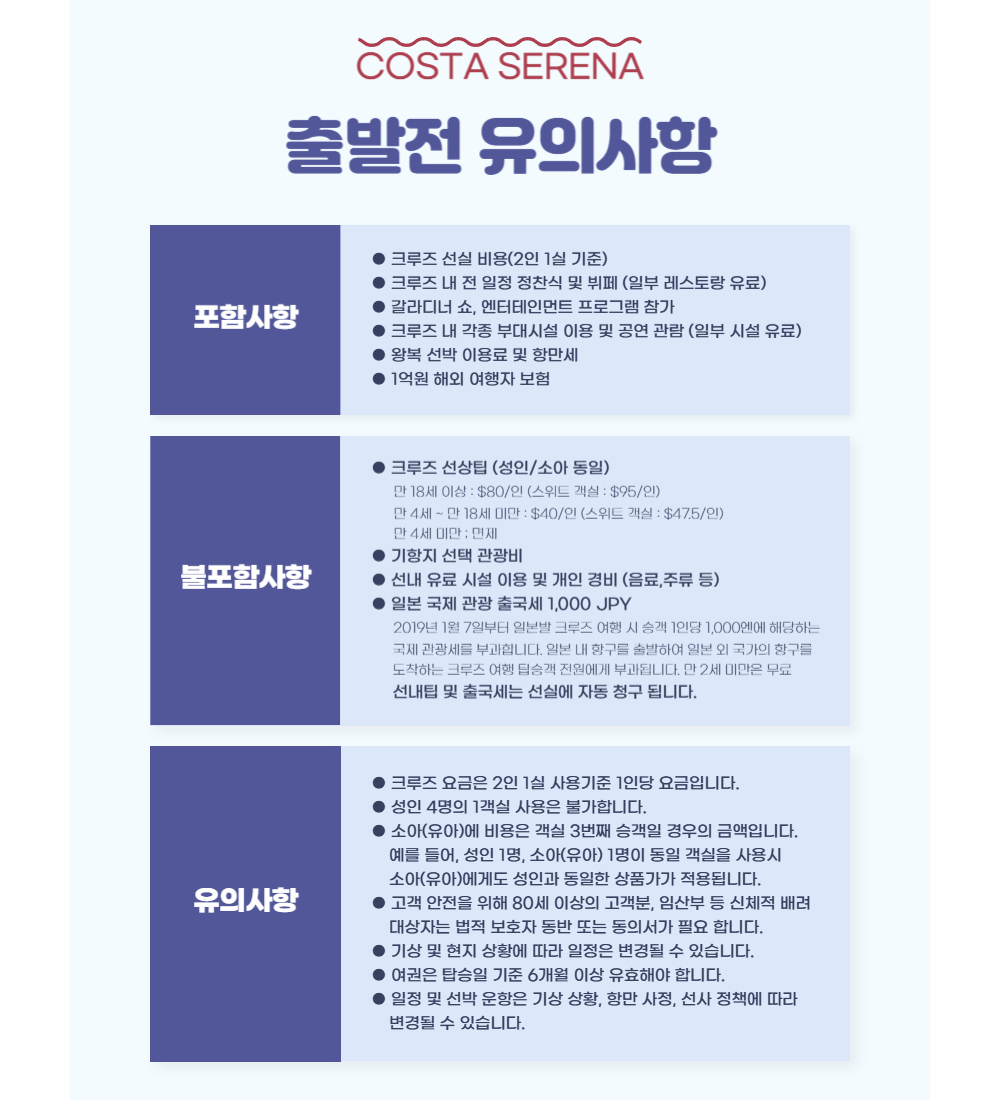 🚢 코스타 세레나호는 지금 얼리버드 할인중 =3 지금 예약하면 바다 위 럭셔리 휴가를 가장 합리한 가격으로 만날 수 있어요 🌊✨ 💙얼리버드 할인(1인당) ✔️~2025.11.30.까지 : 30만원 할인 ✔️~2025.12.31.까지 : 20만원 할인 ✔️~2026.01.31.까지 : 10만원 할인 *조기예약 혜택은 선착순 마감이며, 사전 예고 없이 종료될 수 있습니다.
