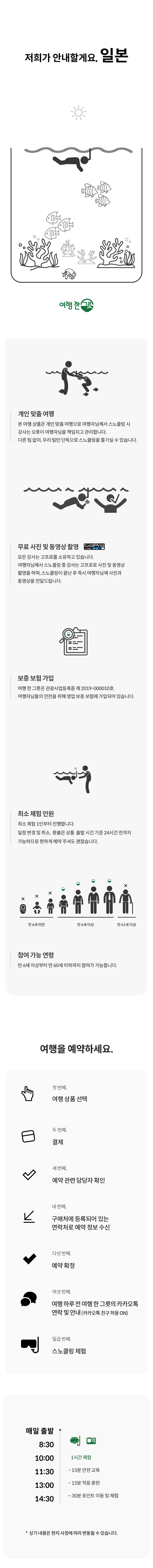 전문 강사가 늘 가까이에서 함께 동행하여 안심하고 참여할 수 있는 여행 한 그릇의 오키나와 스노클링 체험을 소개해요. 무엇보다 다른 팀 없이 단독으로 진행하기 때문에 더욱 안전하고, 고프로를 사용한 사진과 동영상을 무료로 제공해 드리니 즐거운 추억을 더욱 오래 간직할 수 있어요.