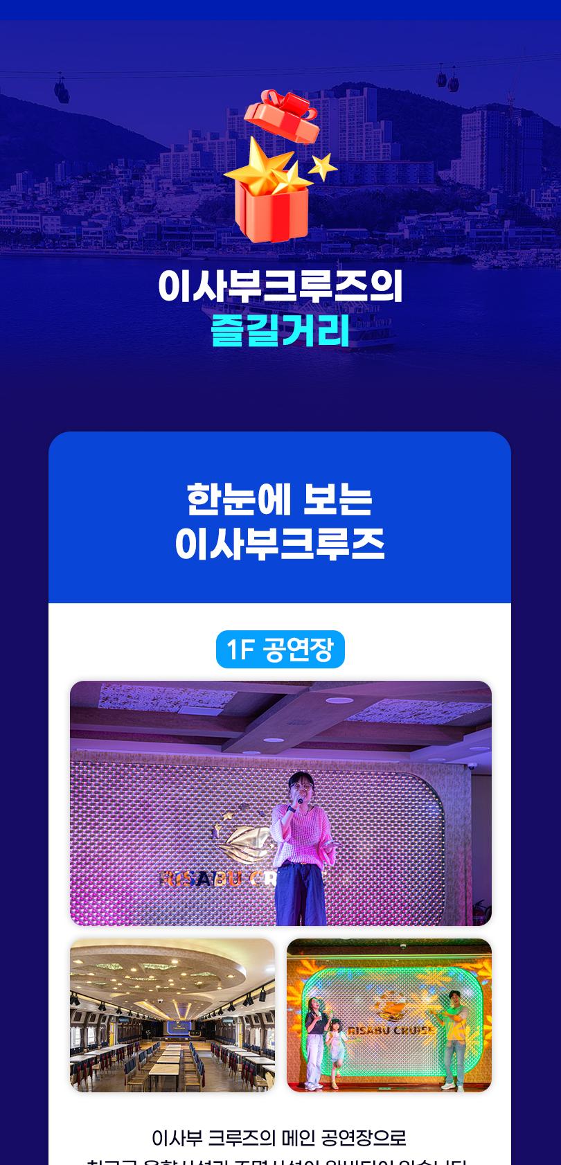 이사부크루즈는 돌산대교를 시작으로 장군도, 이순신광장, 하멜등대, 거북선대교를 지나 오동도를 일주한 뒤 다시 돌산대교로 돌아오는 알찬 코스로 운항돼요. 크루즈 3층 갑판 곳곳에서는 바닷바람을 맞으며 갈매기에게 새우깡을 직접 먹이주는 즐거운 체험도 할 수 있어요. 최고급 음향 시설과 조명 시설을 갖춘 공연장에서는 다양한 즐거움을 만날 수 있으며, 식당과 매점도 마련되어 있어 간단한 식사나 음료를 즐길 수 있어요. 루프탑 카페에서 여수 바다를 배경으로 멋진 사진을 남겨보는 건 어떠세요?