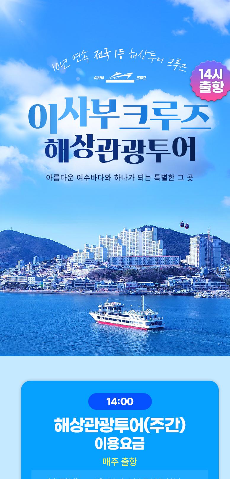여수 이사부크루즈 해상관광투어와 함께 아름다운 여수 바다의 파노라마 뷰를 만끽하고, 갈매기와 교감하며 행복하고 여유로운 시간을 보내보세요!