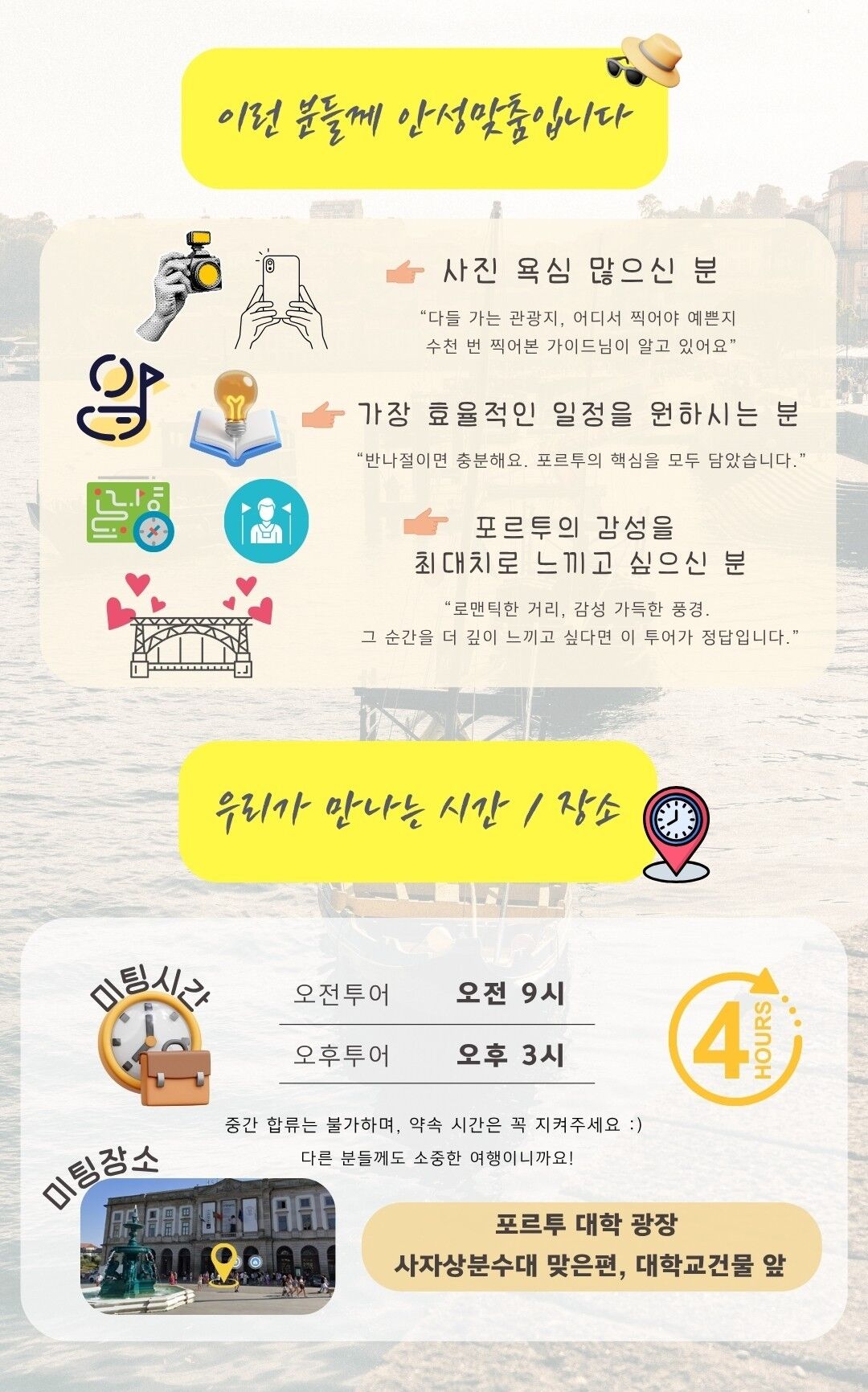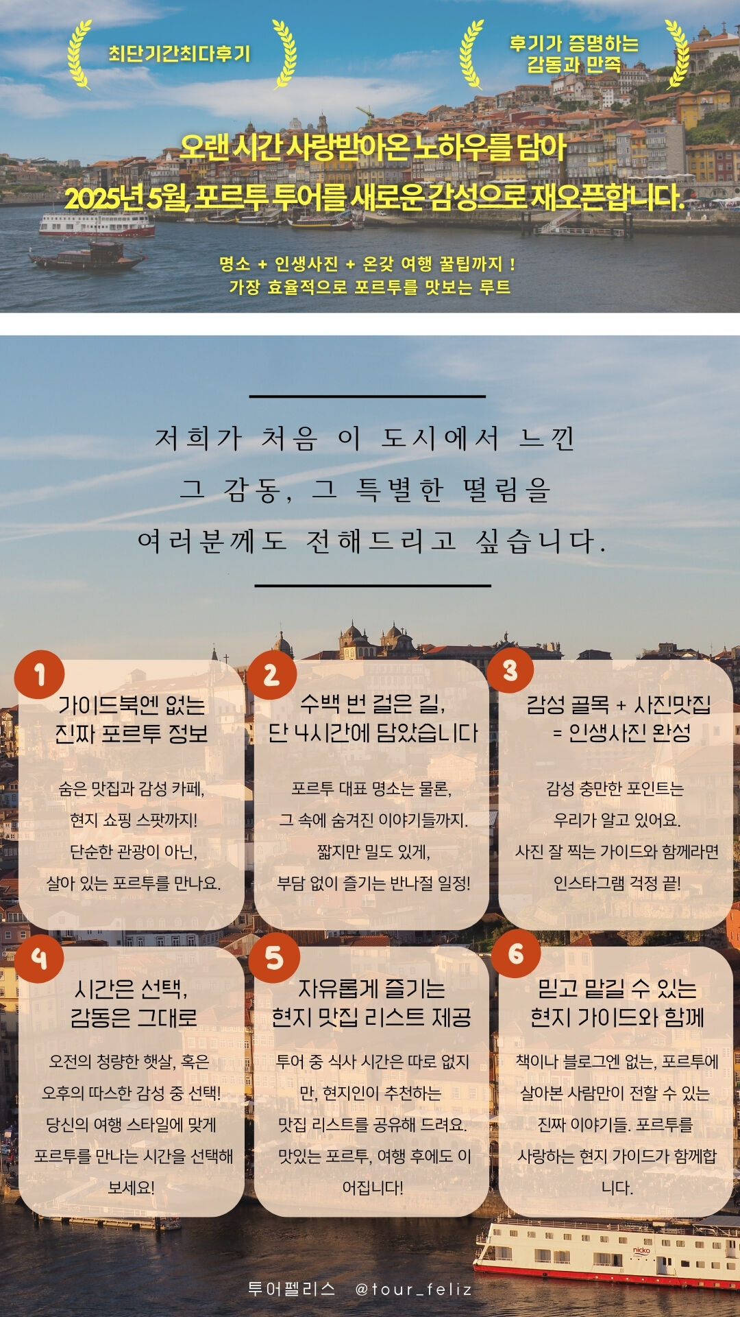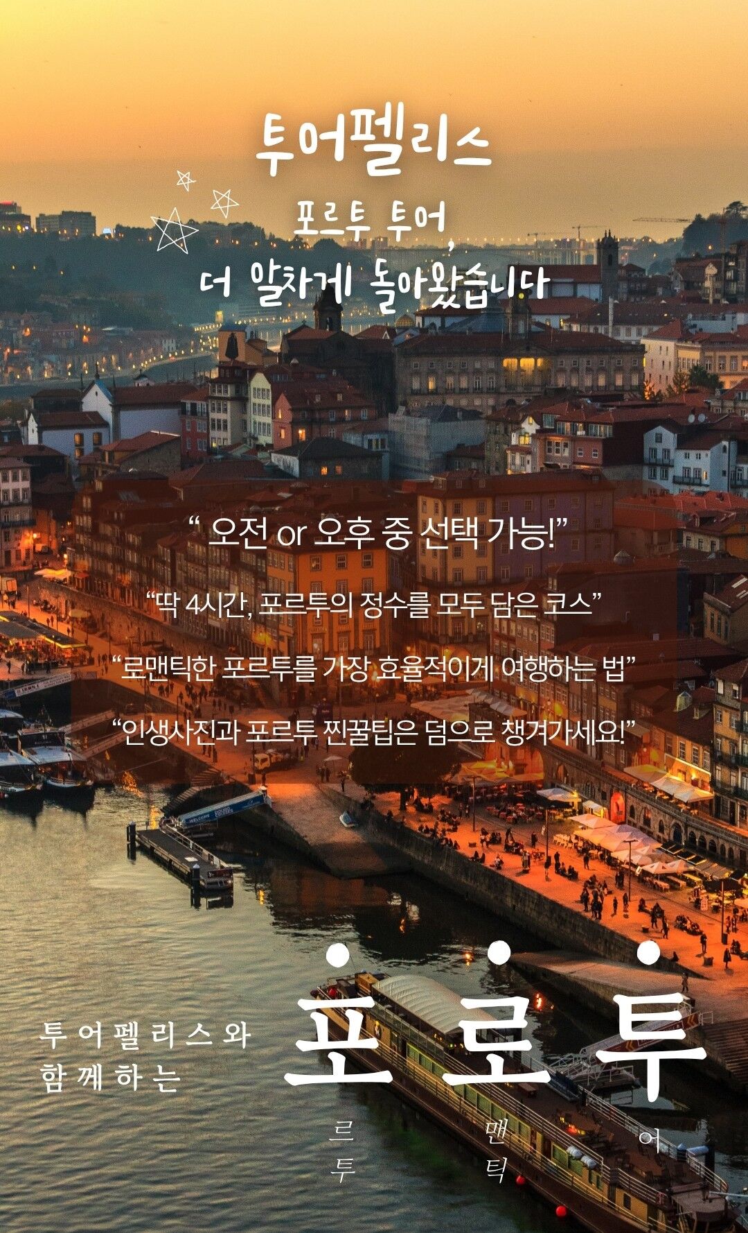 한국어 제공[투어펠리스 재오픈 감사 혜택] 포르투 시내 추가 1만원 할인 혜택을 드립니다🎉정가 44,850원에서 34,800원 !! 할인 적용 방법: 1. 리스본 시내 & 무료 야경 투어 먼저 예약 * 리스본 시내 신청 링크> https://www.waug.com/ko/goods/147321 * 리스본 근교 빅4투어 신청 링크> https://www.waug.com/ko/goods/147319 2. 포르투 시내 결제 옵션에서 ‘리스본 투어 신청자용’을 클릭하여 1만원 할인 혜택 적용 이 혜택은 투어펠리스를 믿고 선택해주시는 고객님들을 위한 감사 혜택입니다. 😊❤️ 지금 바로 예약하고, 리스본과 포르투의 아름다움을 1만원 할인 혜택과 함께 만끽하세요~💫 📢 후기 작성 이벤트🍋 투어에 참여하시고, 정성스러운 리뷰를 남기시면 상큼한 레몬즙을 보내드려요. 이벤트 종료 후에도 본 공지사항을 저장하여 보내주시면 혜택이 인정됩니다! 1. 사진 + 50자 이상의 별 5개 만점 베스트 후기 작성 2. 카카오톡으로 연락주세요~ 스페인산 최고급 유기농 레몬즙을 무료 배송해 드립니다!🚚 (한국 배송만 가능) 이벤트 종료 후에도 본 공지사항을 저장하여 보내주시면 혜택이 인정됩니다! ⭐리스본 직항 노선 기념 대한항공 승무원, 임직원 및 동반 가족 1인 5천원 할인 혜택! 예약 전 카카오톡 문의해 주세요 (ID: tourfeliz) 투어 희망 날짜, 인원과 함께 문의 주시면 할인 적용된 금액으로 예약 도와드립니다. ※ 이미 정상가로 예약하셨더라도, 메시지로 문의 주시면 할인 처리 도와드립니다😊